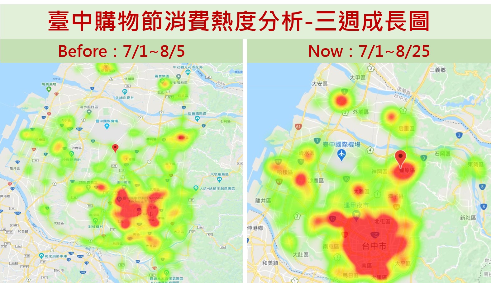 此外,經發局透過大數據,在地圖上用紅、黃、綠色呈現不同的消費熱度,可發現近三周台中市山、海、屯的消費熱區都持續擴散中。山線方面,可發現豐原區、后里區和東勢區在近三周的消費熱度都持續加強;海線方面,梧棲區、大甲區和清水區在近三周則有較明顯升溫;屯區方面則是大里區、太平區和烏日區消費熱度在近三周逐漸顯著。這屆購物節不只創造市區經濟效益,也有效帶動山海屯消費金額成長。