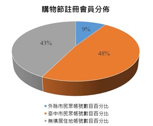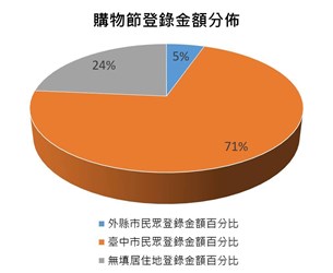 「2020台中購物節」進入最後倒數階段,截至昨(26)日止,累積登錄金額已衝破70億,金額直逼去年總金額的3倍。市府經濟發展局分析前7周消費數據,發現外縣市民眾貢獻購物節登錄金額超過3.6億元,其中又以鄰近台中的彰化縣、南投縣民眾最為「捧場」,且消費熱點除了集中商店林立的市區,OUTLET所在地梧棲及后里區也吸金,顯示這次購物節活動成功帶動人潮進台中,創造