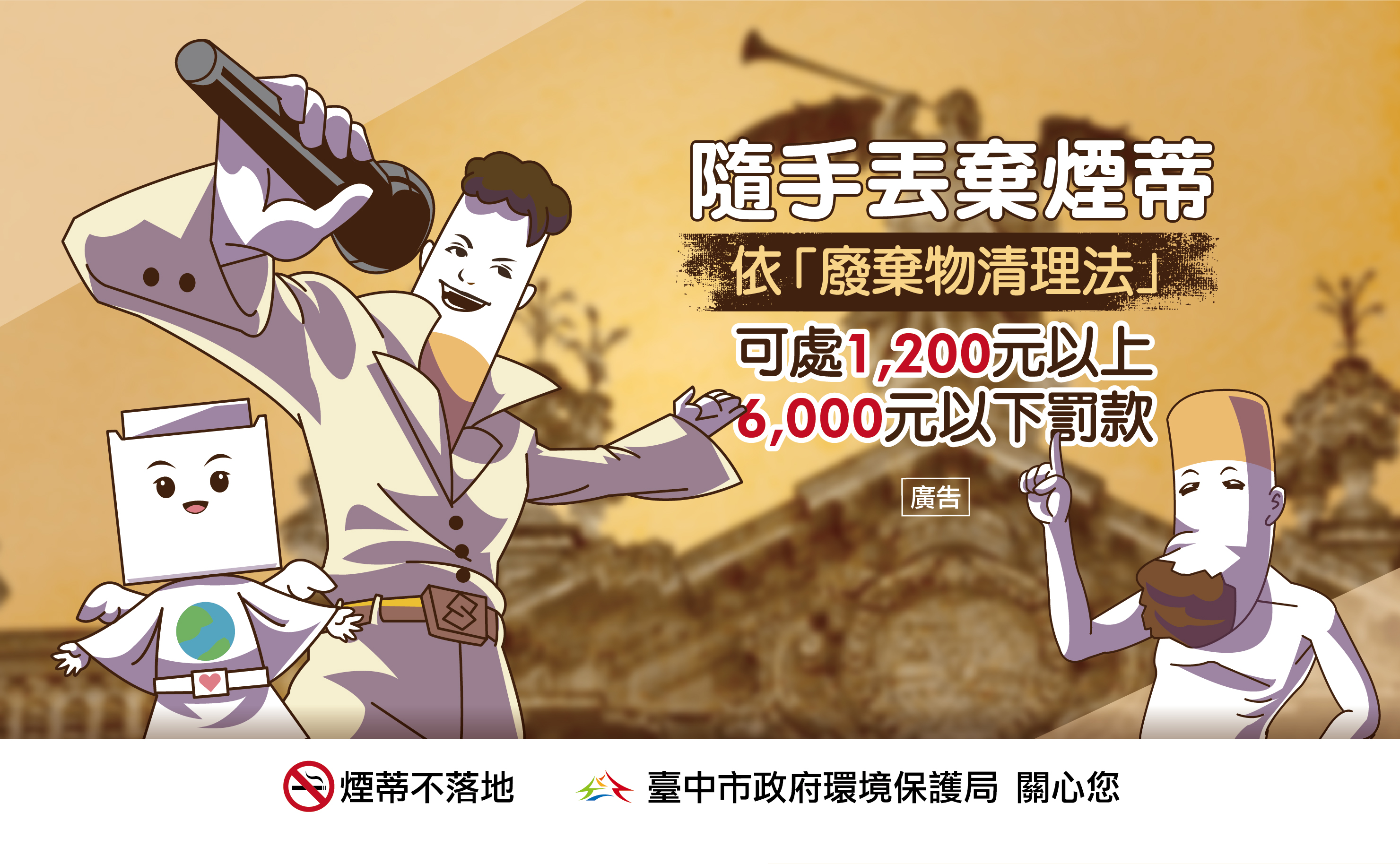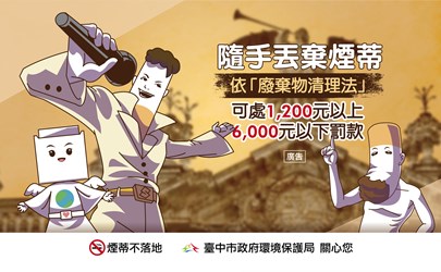台中市政府環保局製作擬人化動畫宣導影片「自備煙蒂盒-煙蒂不落地」,將煙蒂化身為帥氣的煙仔,以詼諧口吻說明煙蒂亂丟對環境的危害,影片更搭配輕快、洗腦的音樂旋律,加強民眾「煙蒂不落地」觀念。環保局長吳志超表示,如查獲隨地亂丟煙蒂,依《廢棄物清理法》可處1,200元至6,000元罰鍰,請吸菸者養成「自備煙蒂盒、煙蒂不落地」習慣。