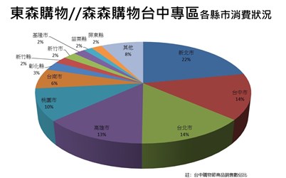 經發局指出,綜合兩大電商平台的消費縣市分析,外縣市民消費佔八成五,其中新北市第一佔24%、台北市第二佔19%、台中市14.5%居第三,高雄市、桃園市和新竹市也排名前段班。