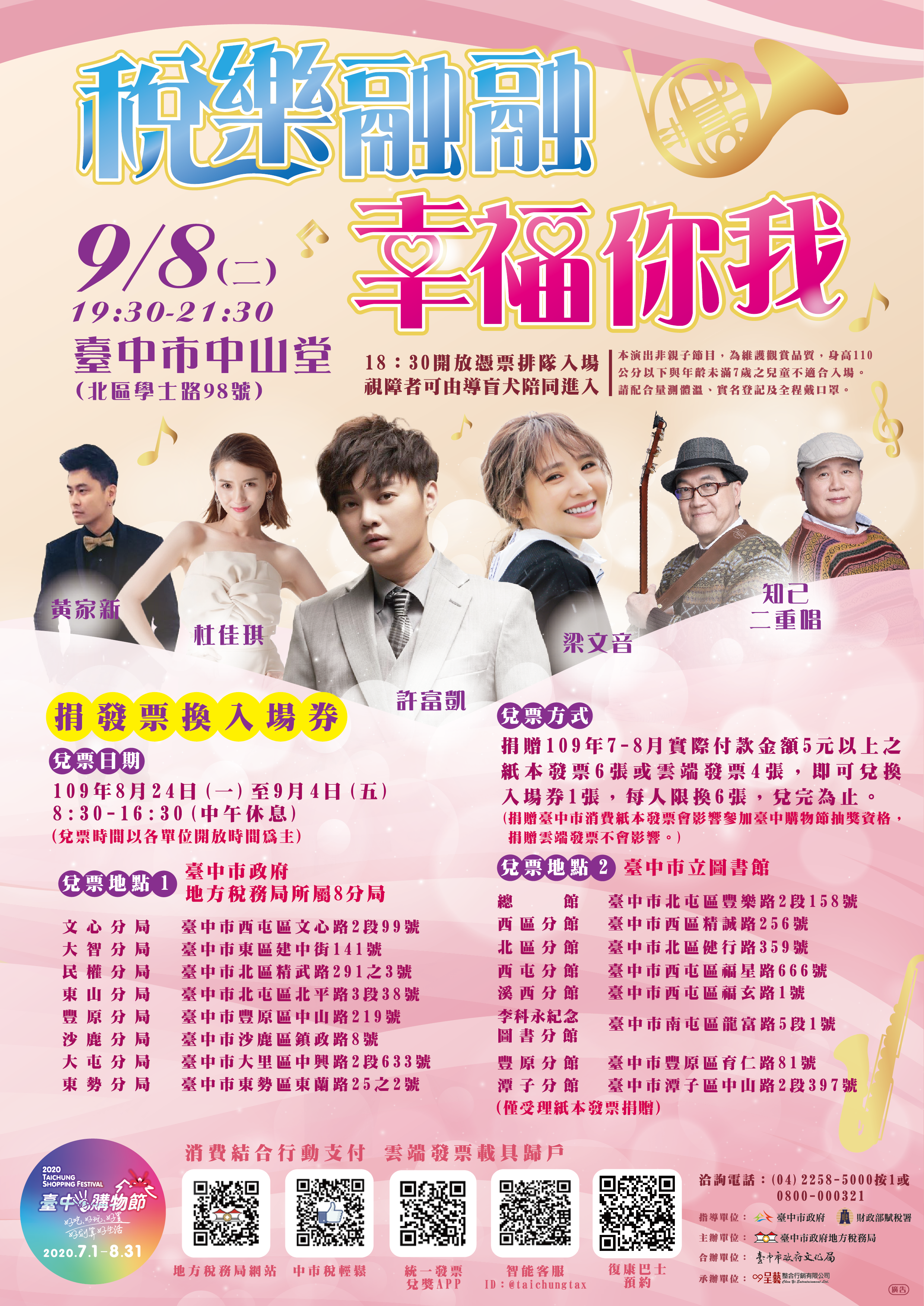 台中市政府地方稅務局舉辦「稅樂融融 幸福你我」演唱會,9月8日晚上7時30分於中山堂登場,邀請實力唱將許富凱、梁文音、黃家新、杜佳琪及知己二重唱等知名歌手輪番上陣演出,民眾捐發票就可免費拿到門票,原訂8月28日截止兌換的活動將延長至9月4日,歡迎踴躍參加。