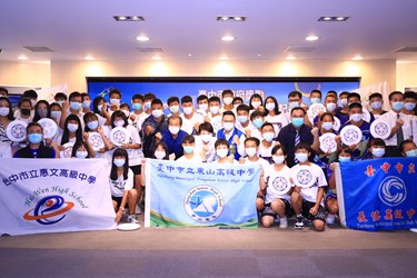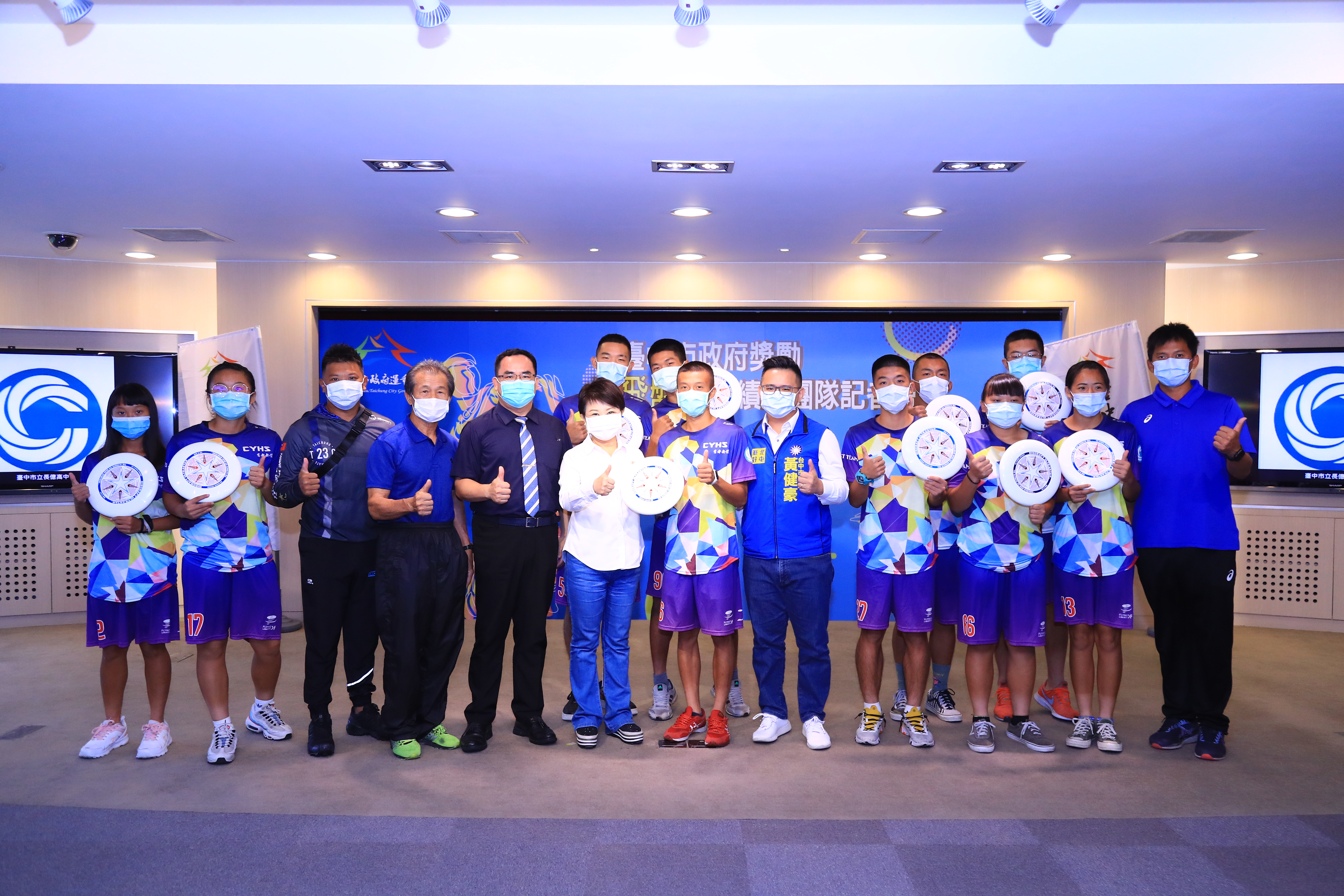 「台中市政府獎勵飛盤運動績優團隊」記者會今日在台灣大道市政大樓舉辦,由盧市長致贈飛盤予績優運動團體,包括黃議員、李局長和多位校長均到場參與。(9/2*18)*運動局