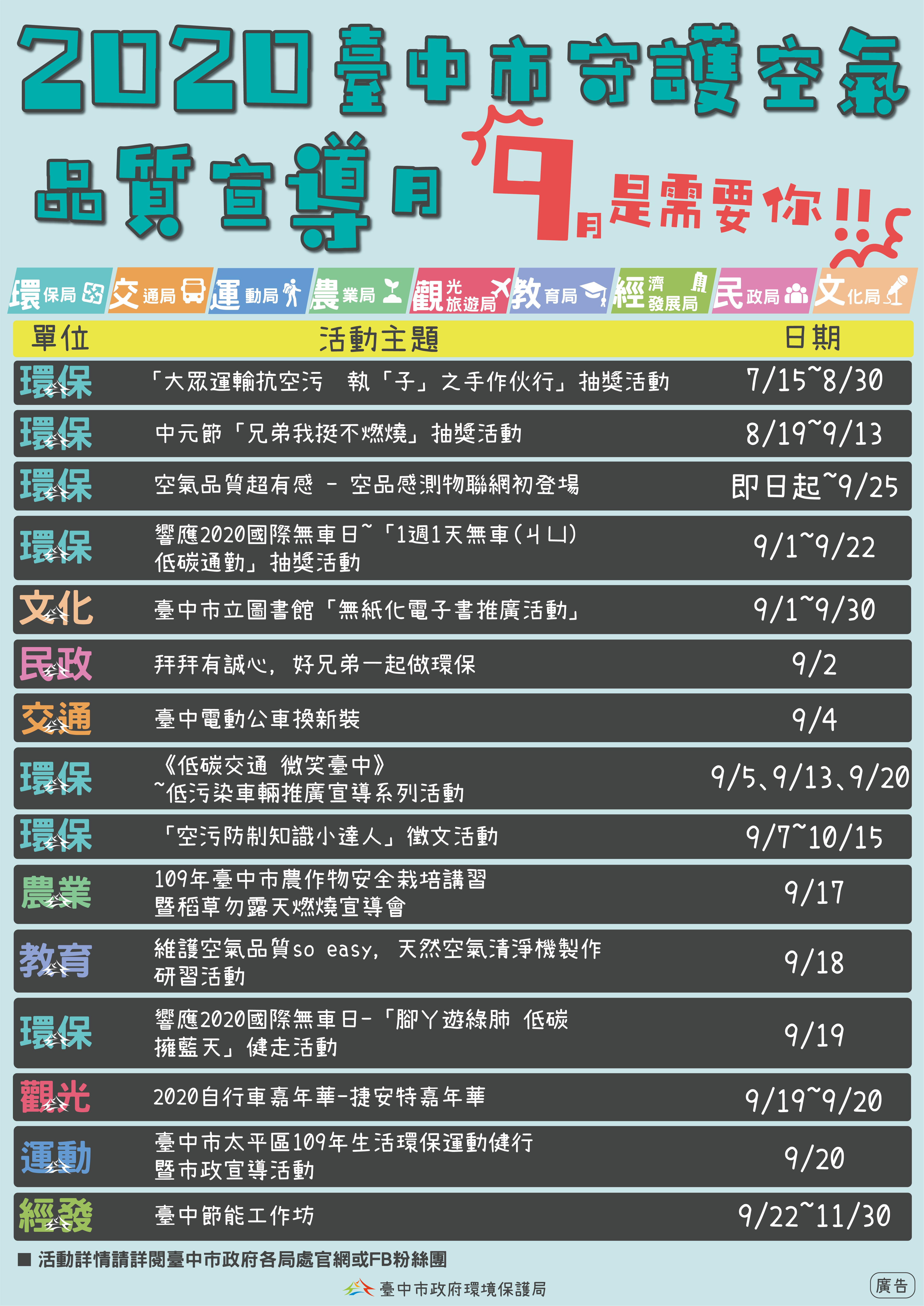 環保局進一步說明,活動包括環保局「空品感測物聯網初登場」、文化局「市立圖書館無紙化電子書推廣活動」、民政局「拜拜有誠心,好兄弟一起做環保」、交通局「台中電動公車換新裝」、農業局「稻草勿露天燃燒宣導會」、教育局「天然空氣清淨機製作研習」、觀光旅遊局「2020自行車嘉年華」,運動局「太平區生活環保運動健行」,及經濟發展局的「台中節能工作坊」等,各局處活動將陸續推出,歡迎民眾踴躍參加。