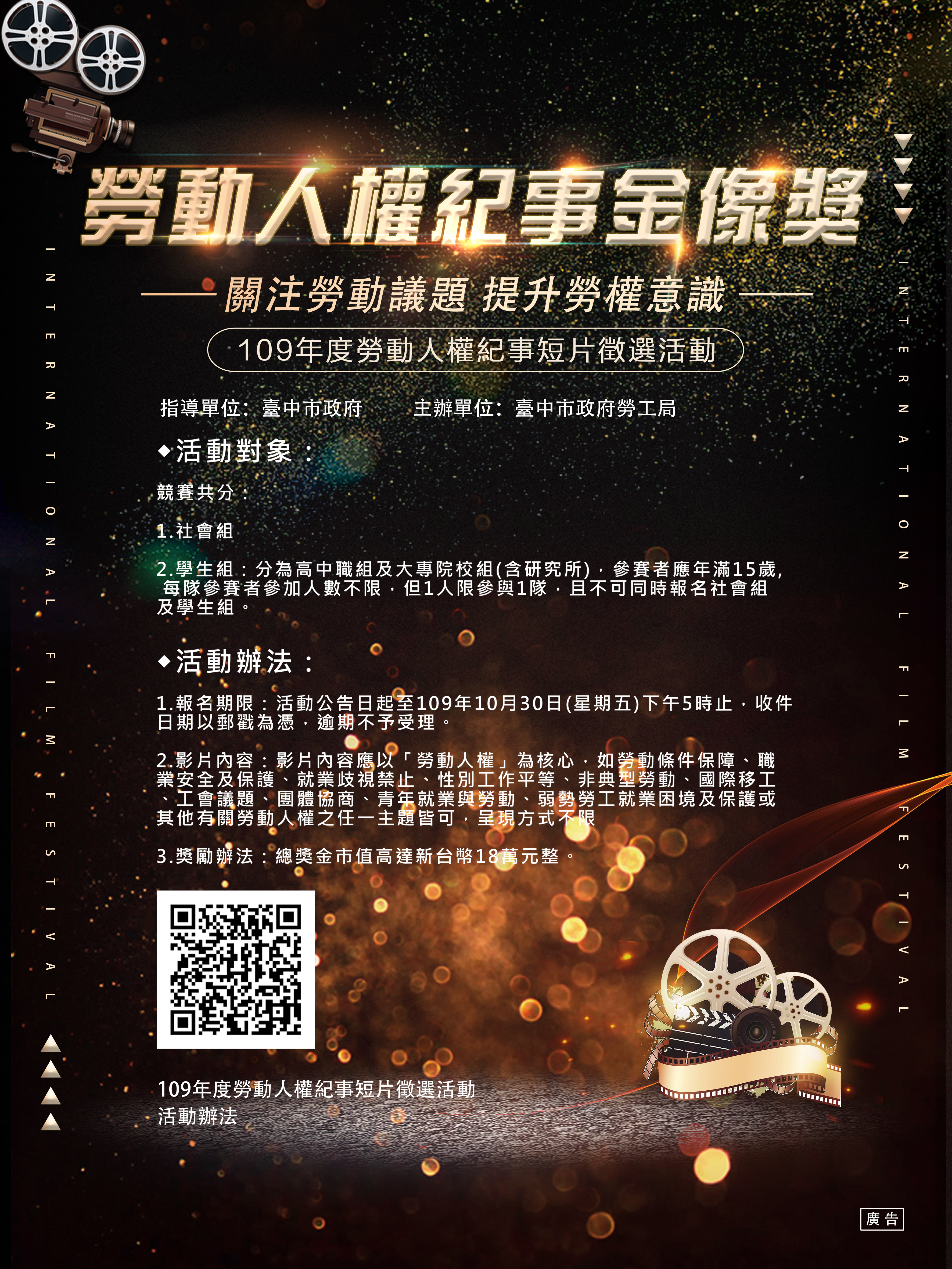 台中市政府勞工局舉辦「109年度勞動人權紀事短片徵選活動」,以勞動人權為核心議題,呈現勞動條件保障、職業安全及保護、就業歧視禁止、性別工作平等、非典型勞動、國際移工、工會議題、團體協商、青年就業與勞動、弱勢勞工就業困境及保護等任一主題均可,短片長度限制3到5分鐘,表現方式不限,最高獎金3萬元,總獎金18萬元,歡迎全國民眾踴躍報名參加。