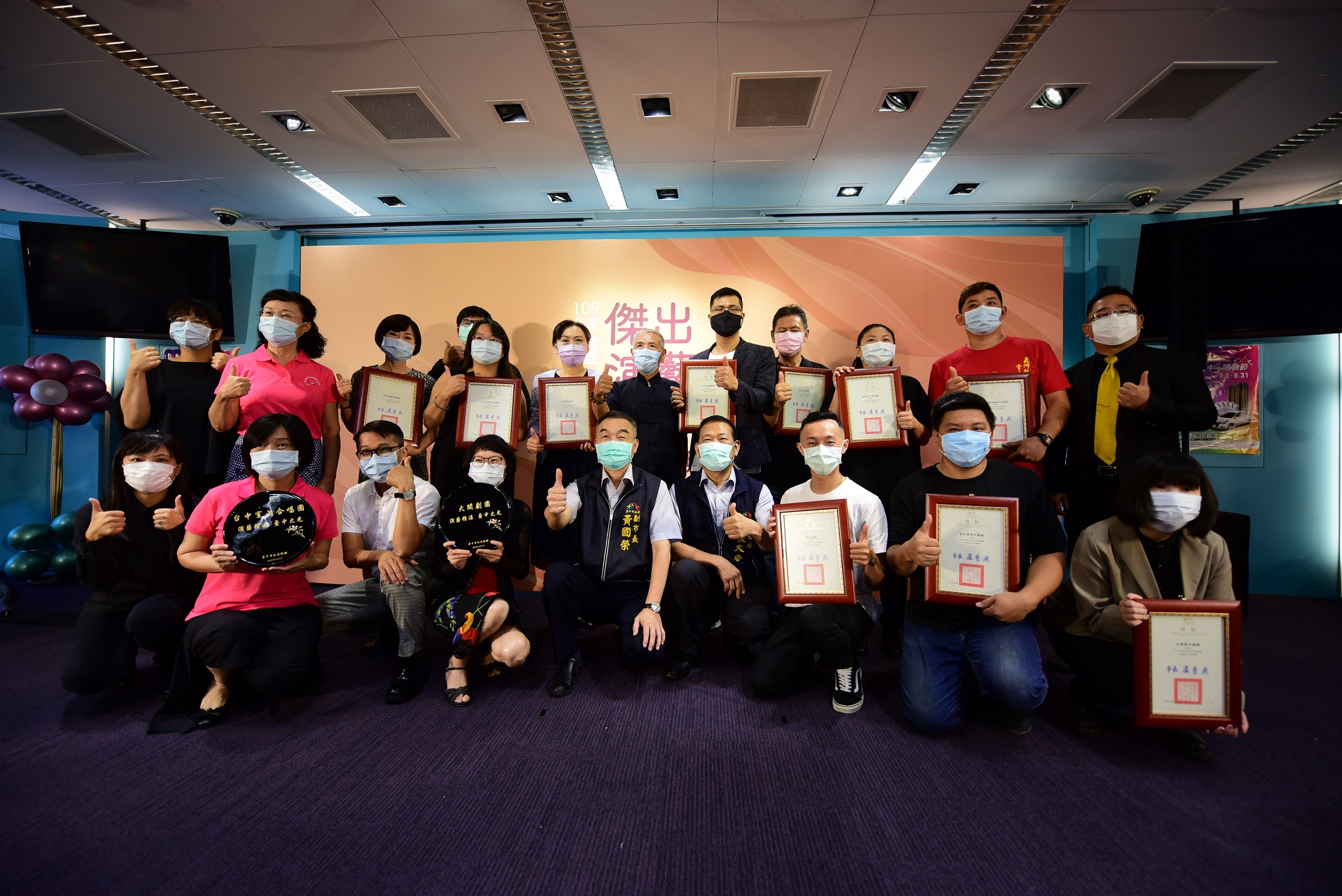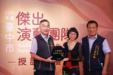 台中市政府文化局致力扶植在地演藝團體,透過徵選與獎勵計畫協助優質團隊長期發展,109年度入選的10大傑出演藝團隊包含戲劇類5團、音樂類3團及舞蹈類2團。副市長黃國榮今(4)日在台灣大道市政大樓授獎給脫穎而出的「演藝10傑」,同時表揚台中市入選國藝會獎助專案團隊,鼓勵及肯定團隊做為台中指標性藝術品牌的重要性與成就。
