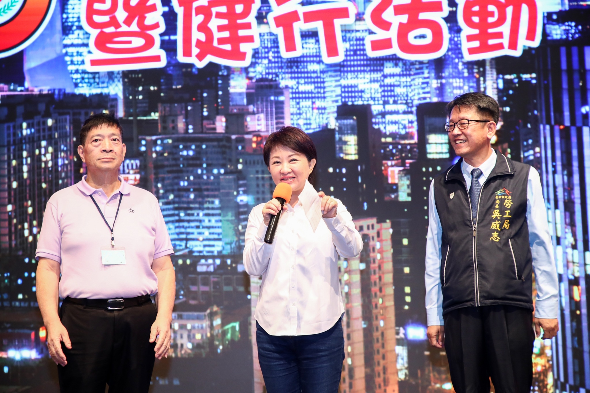 今日活動現場,包括市長盧秀燕、勞工局長吳威志、前台中市議長張清堂、勞動部勞保局台中市第二辦事處主任紀銘歧、大台中職業總工會理事長林蓮助、台中市產業總工會理事長廖誼炳、中華民國全國營造總工會理事長王英吉、以及各縣市營造工會理事長皆出席祝賀。(9/5*15)*勞工局