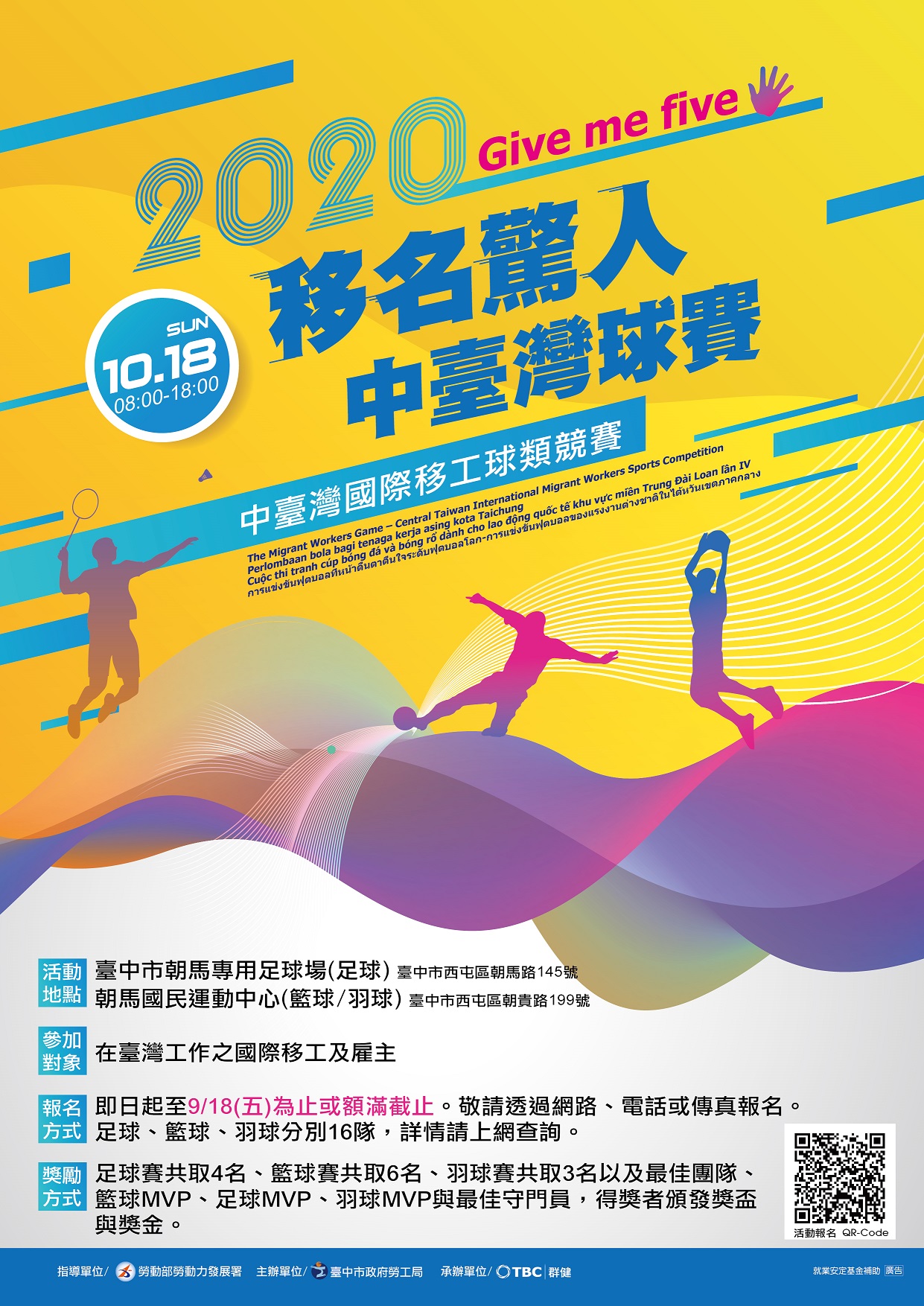 「2020移名驚人中台灣國際移工球類競賽」將於10月18日火熱登場!台中市政府勞工局表示,台中市邀請彰化縣、南投縣、苗栗縣、雲林縣及嘉義縣市等中部縣市一同參與,當日將在台中市朝馬專用足球場及朝馬國民運動中心,分別舉辦足球、籃球及新增的羽球競賽,歡迎移工朋友踴躍報名參賽。