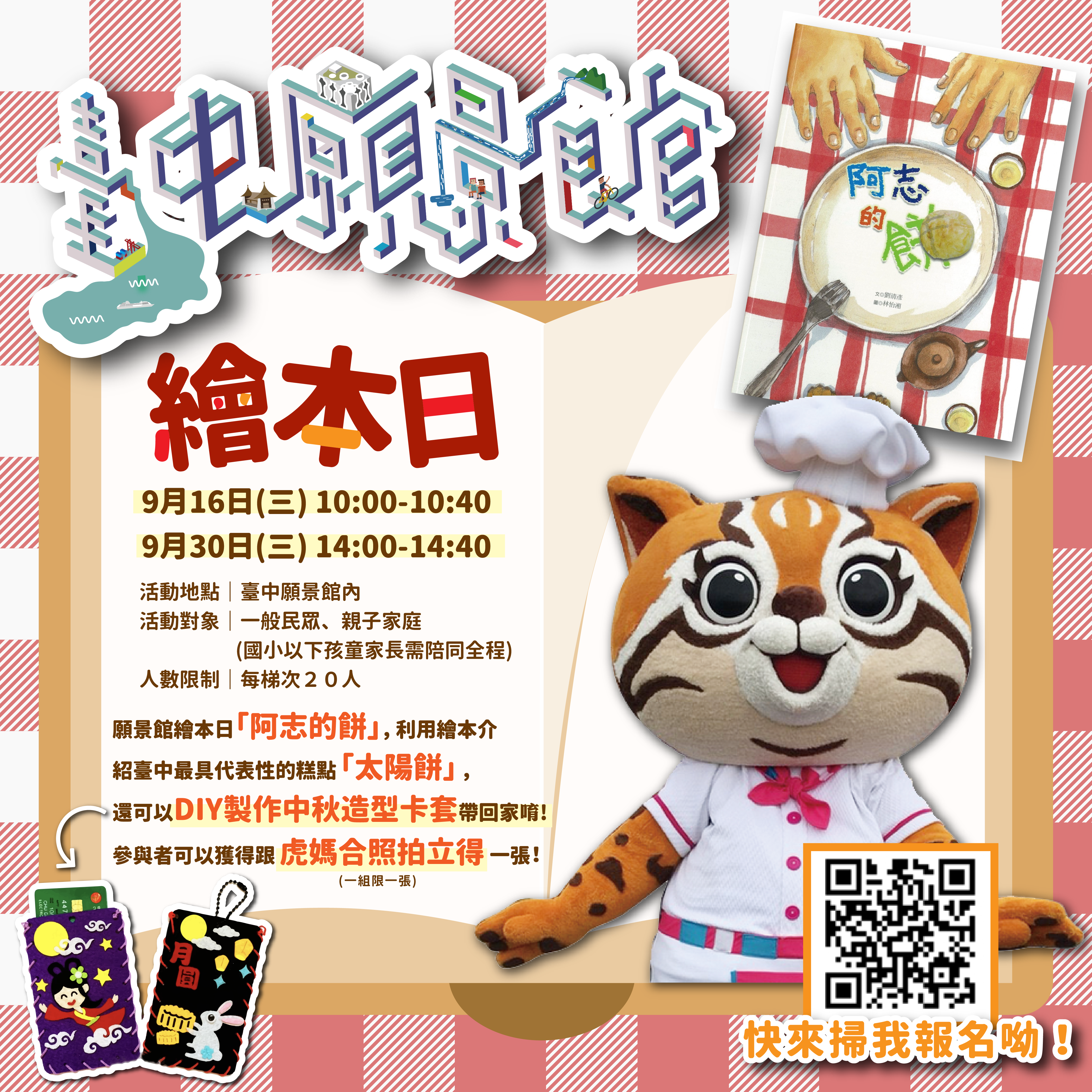 「糕點師傅虎媽」要來願景館囉! 台中願景館將於9月16、30日辦理繪本日活動,以繪本「阿志的餅」為主題,帶領民眾認識台中最具代表性的糕點「太陽餅」,現場還可手作中秋造型卡套、與台中吉祥物虎媽合照拍立得1張,報名自即日起至額滿為止,歡迎大小朋友參加,與虎媽一起來認識台中獨特的糕餅文化。