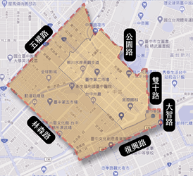 都發局說明,該補助計畫以中區及其周邊街區為主,範圍東至公園路與大智路,西至林森路,南至復興路,北至五權路,且以屋齡30年以上合法建築物為補助範圍及標的。申請補助項目包括建物本體外部改善與室內裝修,補助上限90萬元,專業服務費用補助上限10萬元,兩者合計補助金額上限為100萬元,申請人須自籌至少總工程金額30%。