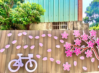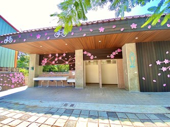 她表示,此次六角亭公廁整修,老舊設備及管線全部更新,並加強照明及通風設備,且特別增設親子廁所,部分蹲式馬桶改建為坐式馬桶,讓長者使用更加便利,外部景觀以鐵砧山櫻花美景及在地特色產業自行車為主題,並與日式木造風格相搭配,營造出異國浪漫風,還沒進公廁就被吸引。