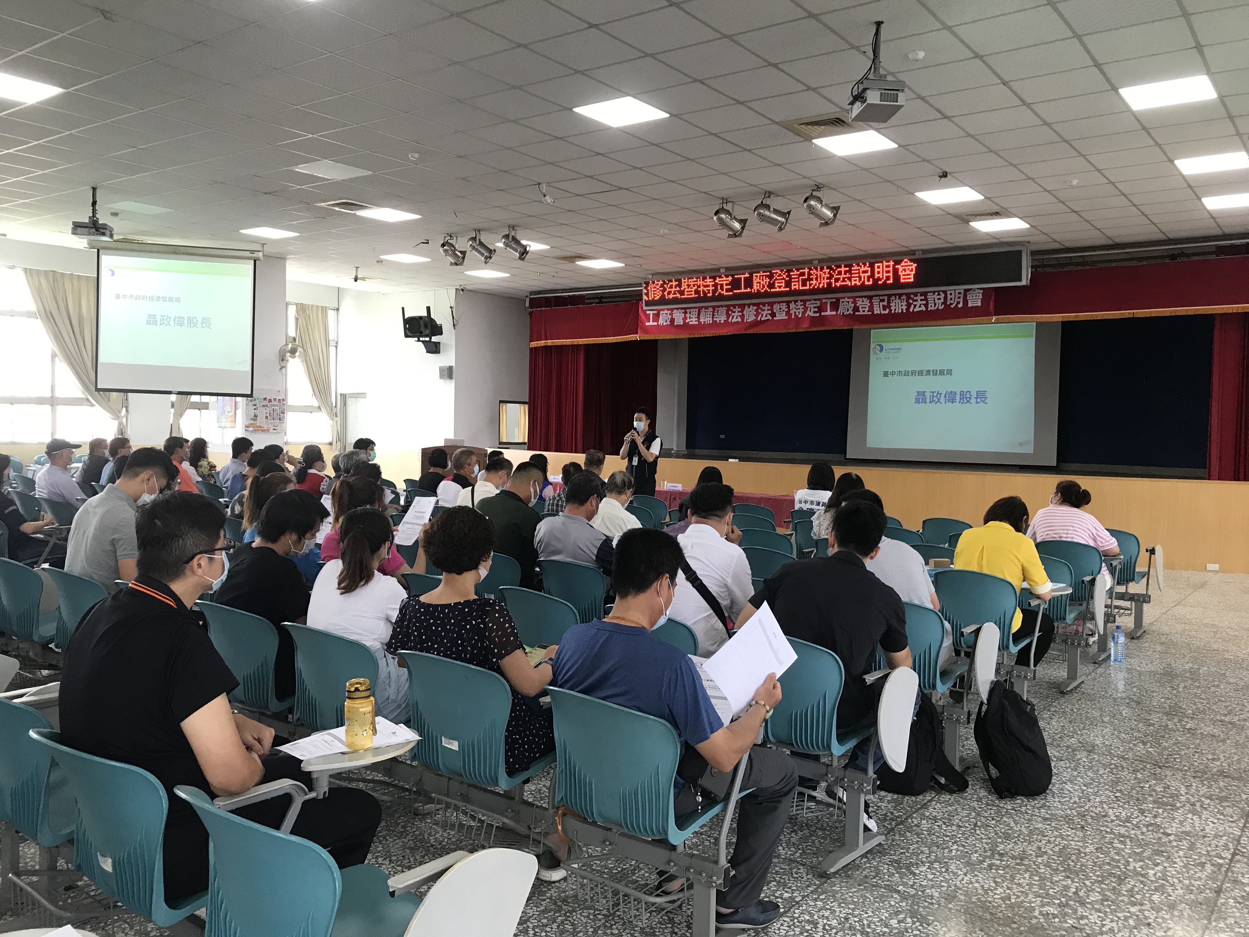 中市府為推動「特定工廠登記」制度,自108年7月至今年8月止已召開13場說明會,累計參與人數近2,400人,更於會後將民眾常見問答彙整成Q&A公告於官網供民眾參閱,並預計於今年底前再辦理8場次說明會,持續至地方與業者面對面說明及溝通,減少資訊不對稱現象,增加業者對特定工廠登記了解及提升申辦意願。