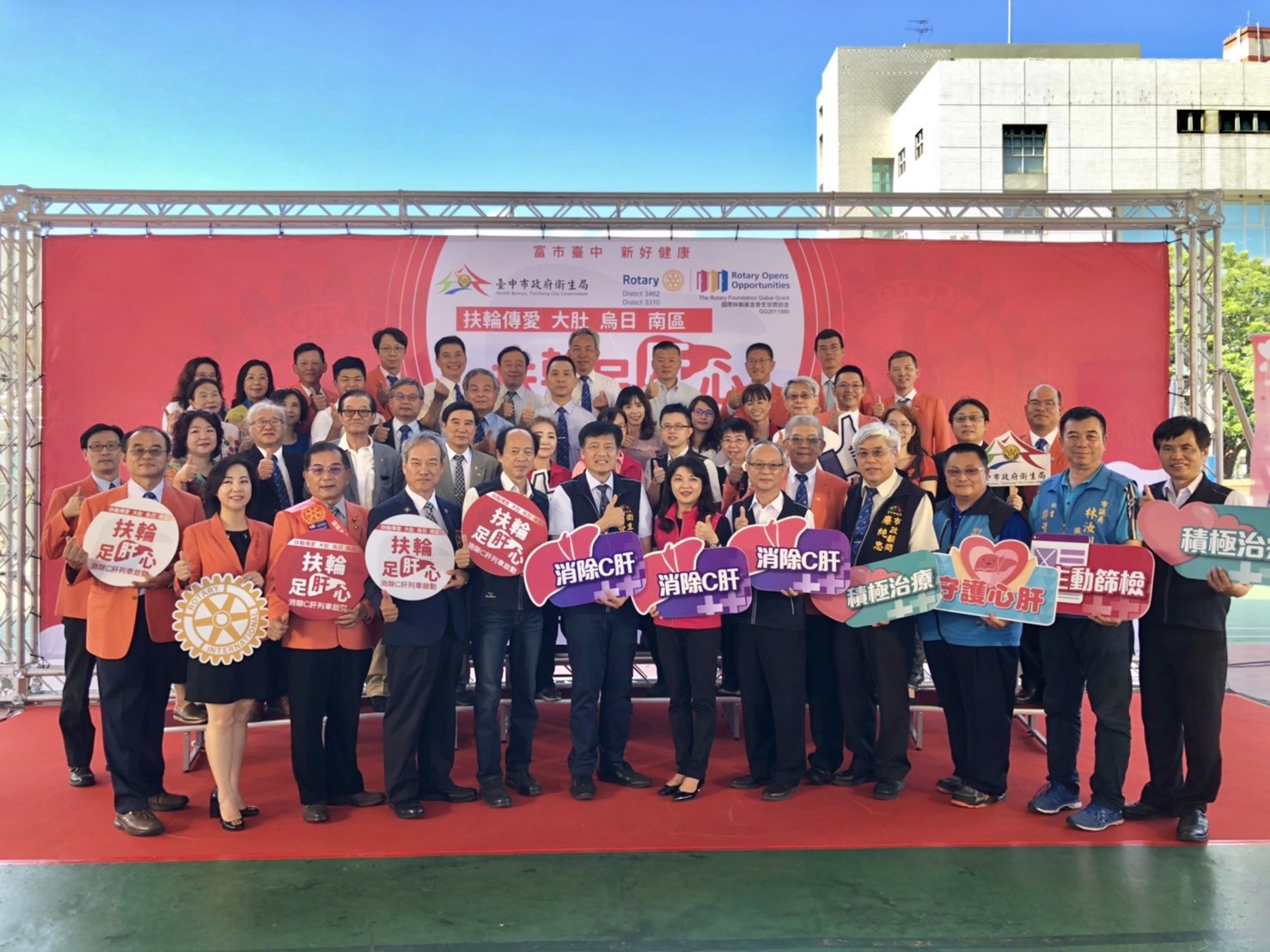 今日啟動會包括參議賴森林、市政顧問廉純忠、市議員吳瓊華、副議長顏莉敏辦公室主任、市議員林汝洲服務處秘書、烏日區長陳嘉榮、大肚區主任秘書黃金龍、國際扶輪3462地區總監葉惟堯、台中環中扶輪社長張峻誠,及烏日澄清醫院、光田醫療社團法人光田綜合醫院、林新醫療社團法人烏日林新醫院、澄清綜合醫院、童綜合醫療社團法人童綜合醫院等院所代表也一同到活動會場,宣示打擊肝病,鼓勵市民踴躍受檢,為自己健康把關。(9/20*6)*衛生局