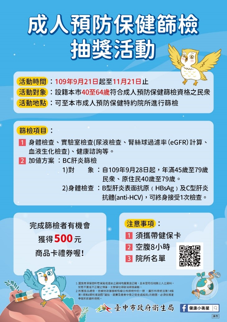 台中市政府衛生局推廣成人預防保健服務,結合特約院所舉辦109年度「成健護健康,篩檢抽好康」活動,即日起至11月21日止,凡符合40歲至64歲篩檢資格的市民,到特約院所完成篩檢,即可參加抽獎活動,歡迎市民踴躍至特約院所進行成人預防保健篩檢,一起顧健康,抽好康。