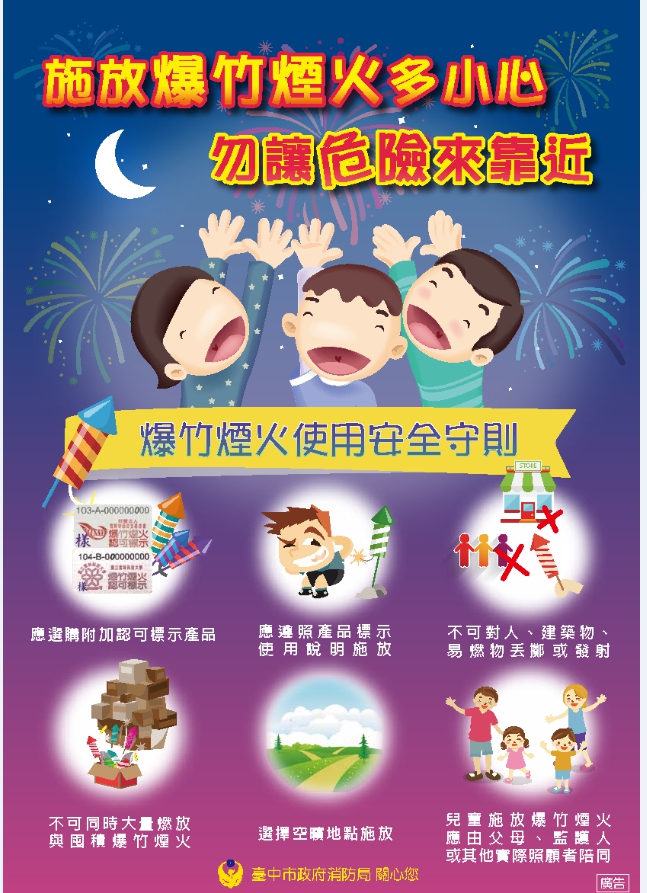 消防局提醒,依「台中市爆竹煙火施放管制自治條例」規定,於0時至6時施放飛行及升空類的一般爆竹煙火,應申請專案許可,並詳閱產品使用說明後才能施放,如有違反,將處以3萬元以上、15萬元以下罰鍰。另未滿12歲兒童不得單獨施放爆竹,需由大人在旁陪伴,違者將對家長處3千元以上、1萬5千元以下罰鍰。