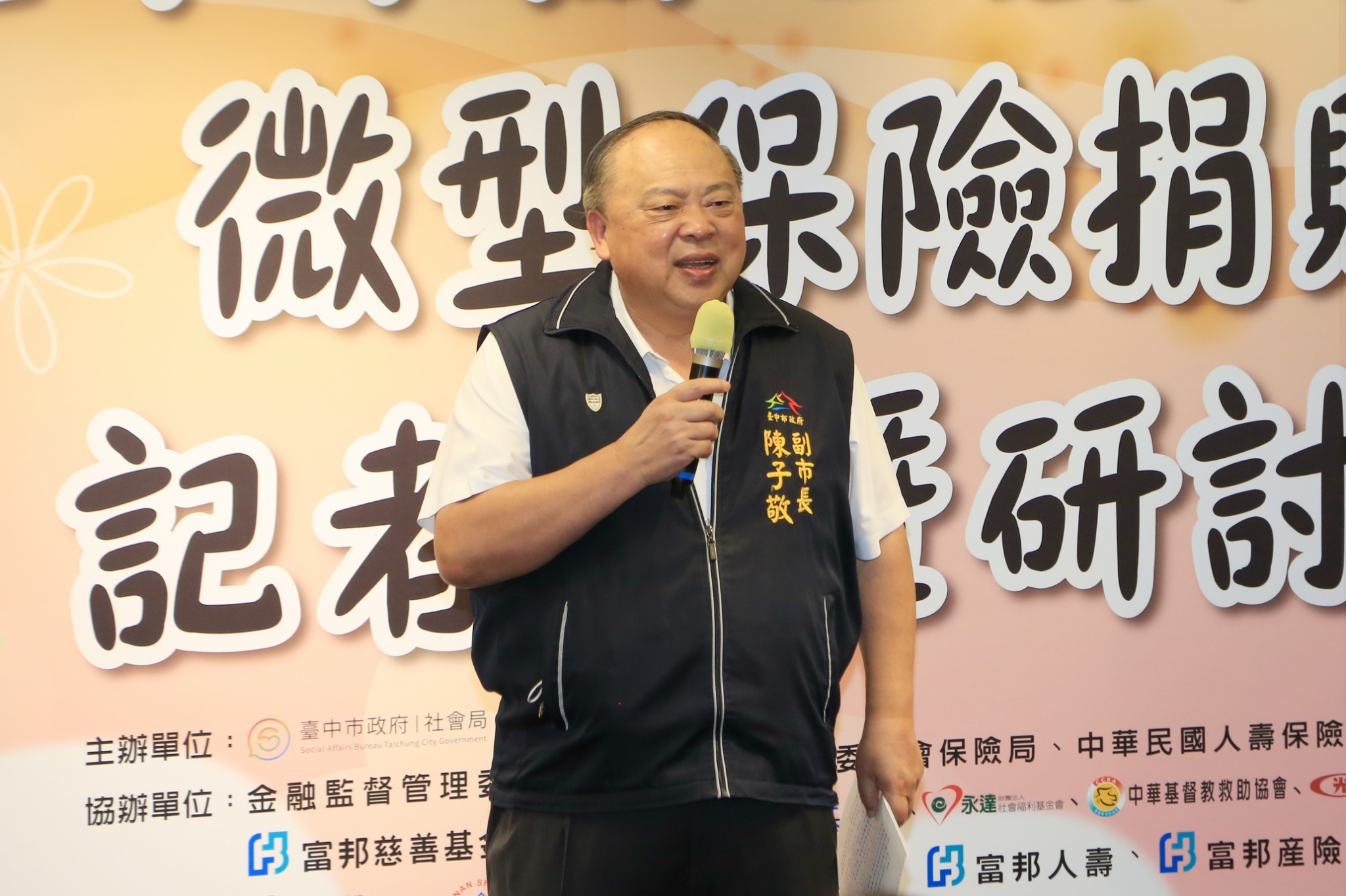 社會局今(25)日舉行低收入戶微型保險捐贈記者會暨研討會,副市長陳子敬表示,儘管台中整體經濟狀況良好,但仍有部分低收入戶家庭生活困頓,政府有責任也有義務照顧他們,尤其天有不測風雲,當保險公司獲知個案意外失能或身故時,可立即通報社會局,讓家戶在最艱困時,獲得即時幫助。