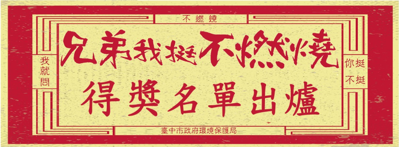 環保局表示,市府邀請知名網紅聖結石擔任「兄弟我挺不燃燒」環保活動代言人,加深民眾環保祭祀的觀念,逐步將燒紙錢的傳統習俗導向紙錢減量集中燒、「以功代金」、「以花代香」等方法,省下的燒紙錢再幫助中市貧困學童或弱勢團體,兼顧信仰、環保與愛心之效。