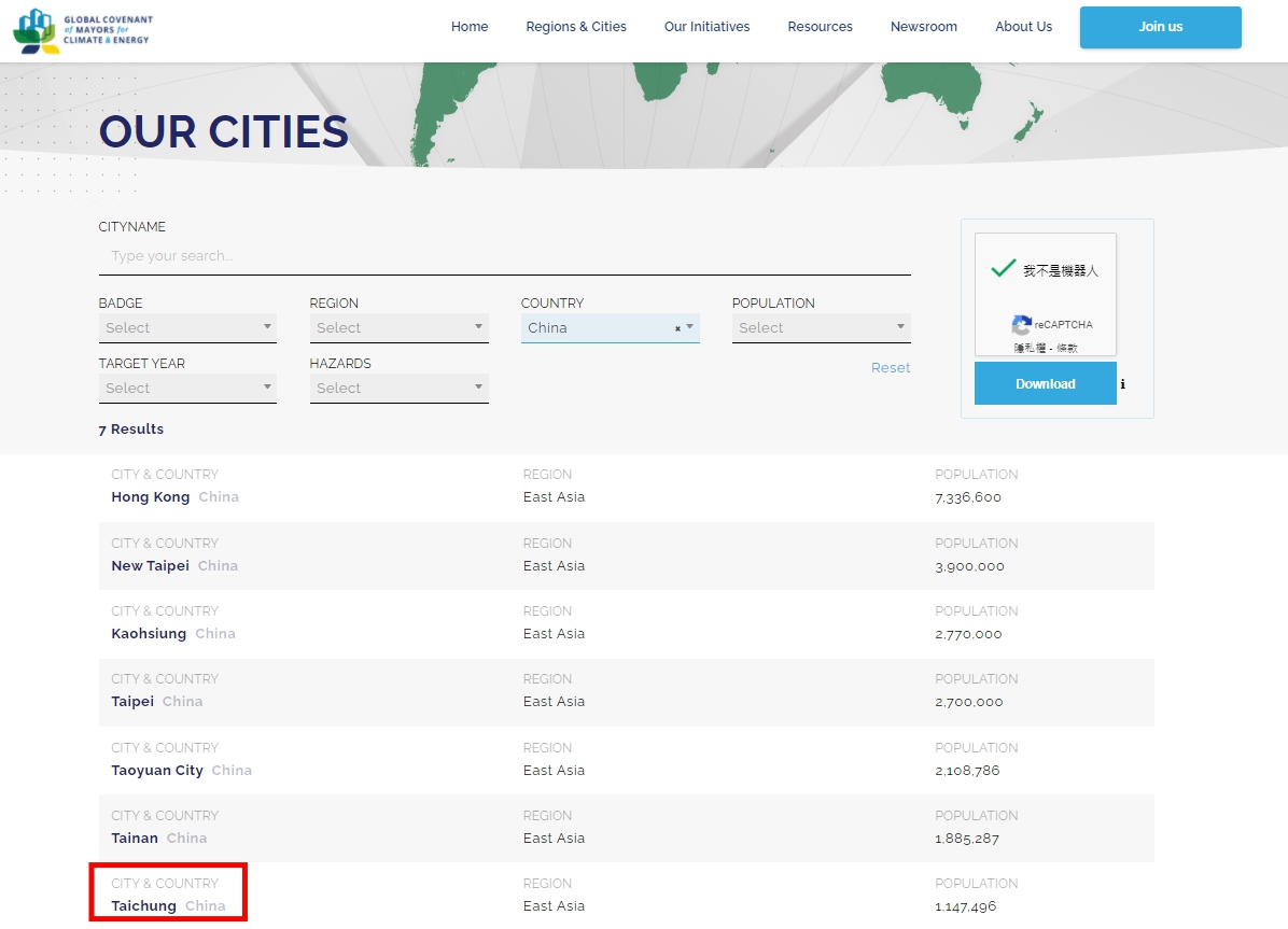 有關「全球市長聯盟」於「地方政府永續發展理事會」(ICLEI)網頁中,公布符合聯盟減碳規範的城市名單,其中將台中市及台灣其他5個城市的國籍均列為「China」(中國),台中市政府已向ICLEI及「全球市長聯盟」嚴正提出異議,要求更正錯誤,否則台中不惜退出聯盟。