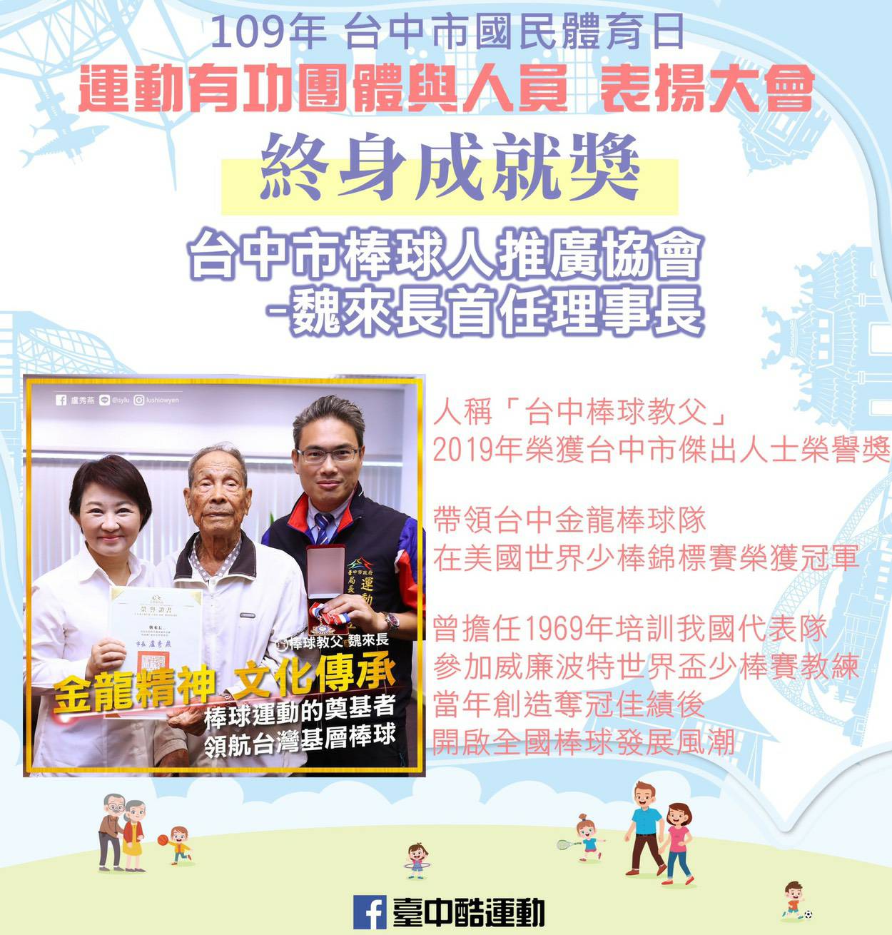 此外,奉獻台中市棒球界超過50年的魏來長,大力推動台日基層棒球交流,因此榮獲「終身成就獎」;還有棒球選手張泰山獲得「運動推手個人獎」;2019年亞太柔道錦標賽銀牌及多次國際世界大滿貫賽、大獎賽獎牌的楊勇緯、在2020年西班牙桌球公開賽、埃及桌球公開賽榮獲男子TT4個人賽銅牌、TT4-5團體賽銀牌的林文信等人榮獲「傑出運動選手獎」。