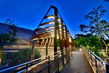 此外,透過景觀跨橋以無障礙坡道連接兩棟建築(長春國民運動中心A棟及B棟場館),下方為水道及慢跑步道,運用不同高程的連接動線,塑造全區景觀動線的流暢感。鋪面材料搭配鄰近的台中文化創意產業園區(台中舊酒場)紅磚造倉庫元素,延續為長春公園北、南兩翼街角廣場的透水陶磚鋪面,園內環池漫步道主要以大地色系的無邊壓花地坪與喬木群落相呼應,局部銜接上仿木紋磚與仿跑道的金鋼砂鋪面,營造出「運動公園」的主題意象。