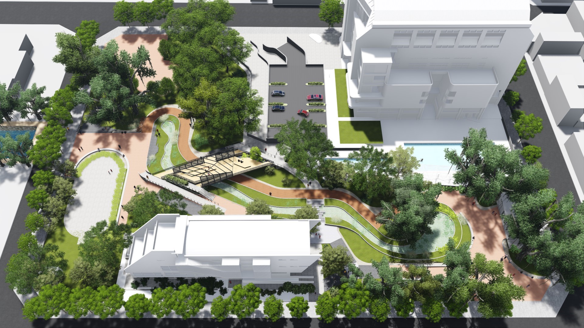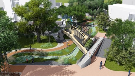 水利局表示,綠川水環境改善計畫(愛國街至信義南街)工程以防洪為優先,採用低衝擊設計兼顧自然生態,以打造擁有防洪安全、淨化水質、景觀空間與人文氣息的城市河川為理念目標。園區內就地保留現地喬木,使工區內林蔭成群,形塑自然的微氣候環境,並利用箱涵頂蓋做雨水收集盤,設置「雨水花園」,末端設置水撲滿,實現水資源回收再利用,淨化後的雨水可使用於公園澆灌系統,也可發揮滯洪效益,完善水循環理念。