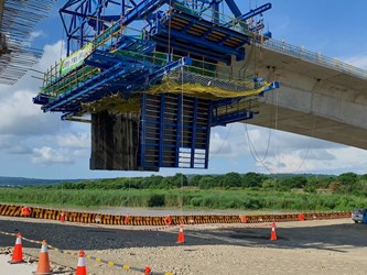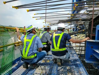 陳局長說明,該工程設計階段即實施風險評估、選用安全工法、合理編訂安全衛生設施圖說規範及經費,在橋梁上部結構採用懸臂大跨徑預力箱型梁、下部結構基礎則以全套管基樁,增加施工安全性並辦理風險評估,同時推動職安卡教育訓練,工程施工團隊皆全數取得台灣職安卡或市府工安卡,落實勞動安全;另施工階段則引進建築資訊模型(BIM)模擬各項施工步驟、施工動線,預先評估施工風險。