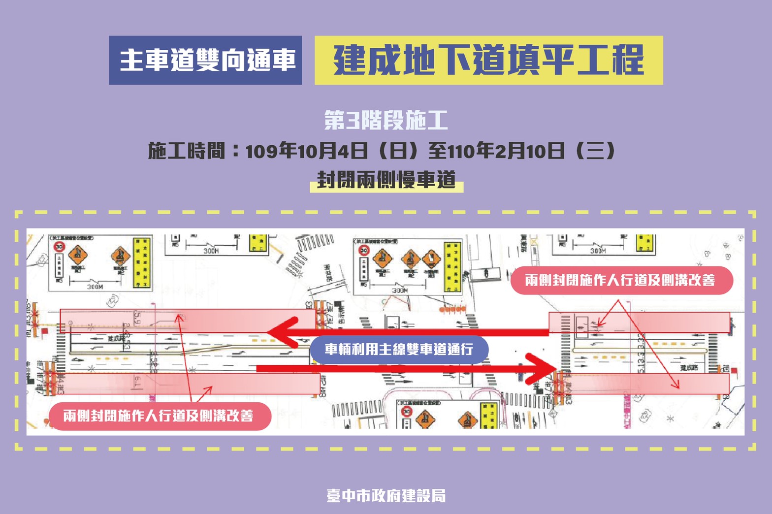 建設局提醒,兩側人行道施作工程將自明日起至明年2日10日進行,請行經建成路地下道的用路人,利用開放的主線雙向車道通行。(10/3*10)*建設局