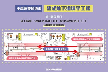 建設局長陳大田表示,東區建成路地下道填平作業開工後,陸續辦理主線車道回填及汙水下水道施作,明日施工進入最後階段,將開放建成路主車道雙向通車,並同步封閉兩側慢車道施作人行道工程。