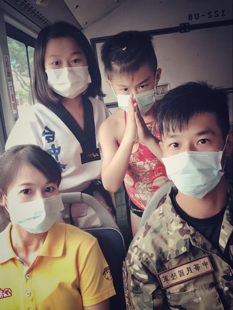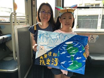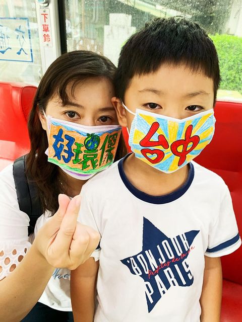 全民抗空污!台中市政府環保局日前邀請中市國小生和家長一起搭乘大眾運輸工具即可參加抽獎,鼓勵更多市民響應低碳生活,吸引411組親子參與,有人cosplay扮演「環保」三太子,也有一家三口分別戴上「空、污、OUT」口罩,一路在公車上宣導反空污理念,創意十足。