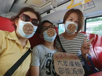 環保局指出,4位創意得主有人戴上「台中好環保」圖案口罩,有人手繪「大眾運輸抗空污」海報,也有一家三口自製「多搭乘大眾運輸節能減碳」手拿牌並戴上「空、污、OUT」口罩,還有小朋友打扮成三太子搭公車,大展創意想法,一路上吸引許多民眾目光。