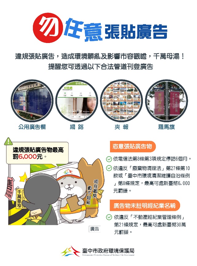 環保局表示,市府針對違規廣告物案件,可依不同法源裁處,例如依《廢棄物清理法》第27條第10款、《臺中市環境清潔維護自治條例》第8條,處3,000元至6,000元罰鍰,或依《電信法》第8條第3項規定,予以停話處分。此次經查獲房仲業者違規事證明確,除依《電信法》第8條第3項規定停話,也移請地政局依《不動產經紀業管理條例》,裁罰6萬元以上、30萬元以下罰鍰。