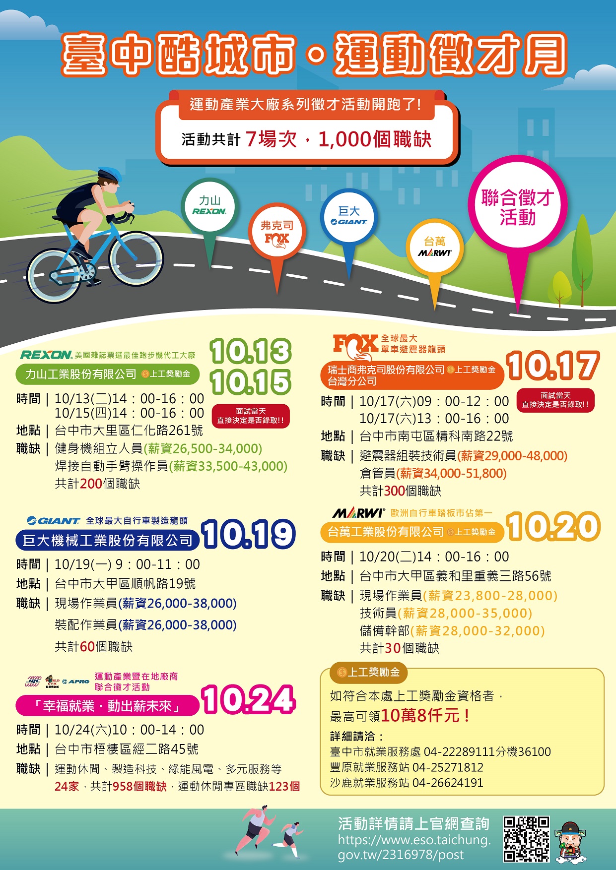 台中市政府勞工局10月13日至24日展開「台中酷城市 運動徵才月」系列活動,邀集世界級運動產業大廠釋出近千個就業機會,包括全球自行車製造龍頭「巨大集團」、單車避震器「瑞士商弗克司」、跑步機代工大廠「力山工業」、自行車踏板大廠「台萬工業」等知名廠商,民眾若符合缺工就業獎勵資格,最高可領取10萬8,000元獎勵金,歡迎把握機會。