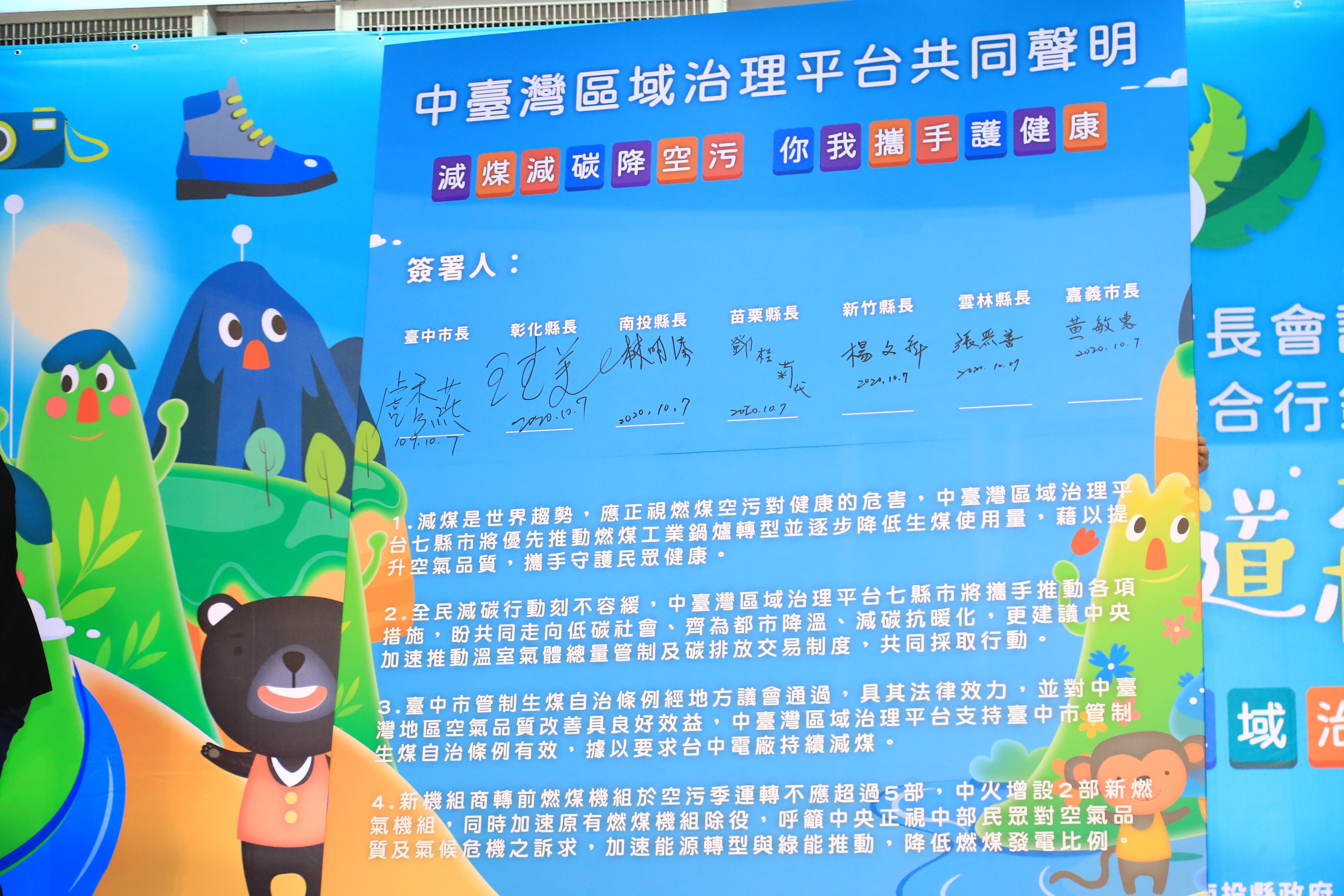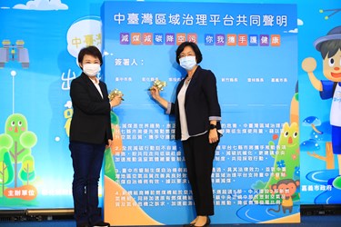「中台灣區域治理平台」今年輪到彰化縣舉行,台中市長盧秀燕今(7)日邀集6縣市首長代表簽署「反空污共同聲明」及「反萊豬為食安把關共同聲明」,除齊力對抗空污,更堅持地方瘦肉精零檢出,捍衛民眾健康與豬農權益;此外,7縣市今日舉辦「出遊吧!觀光步道森遊會」行銷活動,推出大坑、新田等中部20條特色步道,邀民眾趁連假觀光體驗,抽汽車豐富大獎。