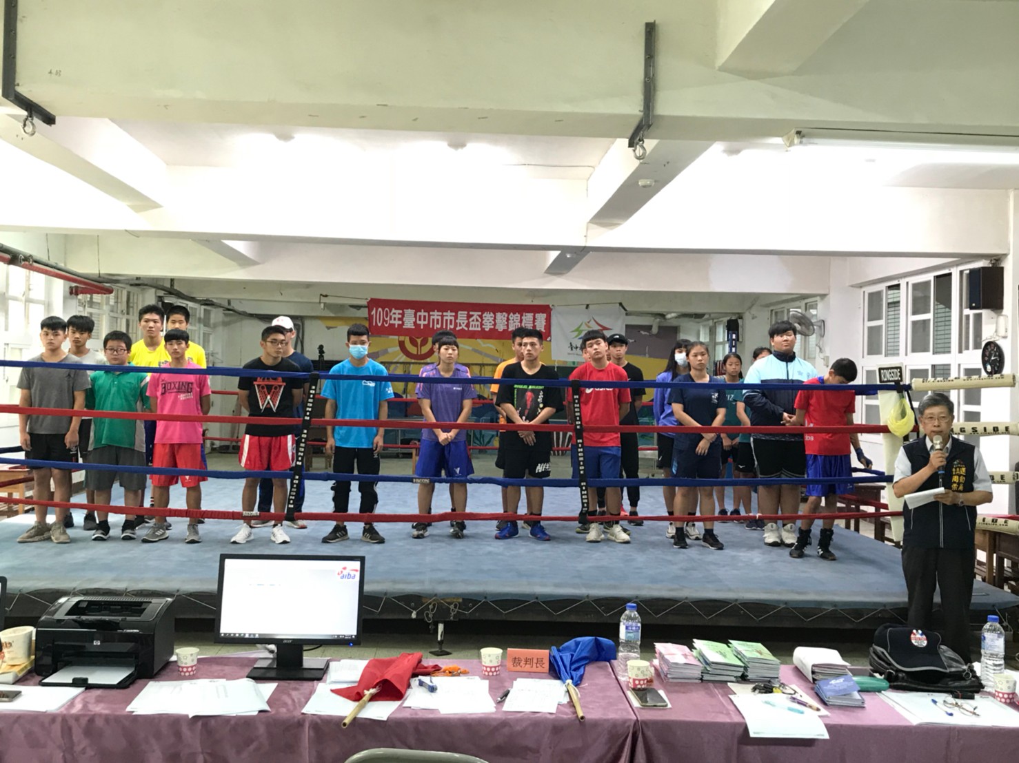109年台中市長盃拳擊錦標賽今(8)、明兩日在清海國中登場,分為國男、國女、高男、高女組,及38.01kg至91.0+kg等32個量級,吸引157人報名參賽。市府運動局專門委員周崇琦也到場為選手加油打氣,期勉拿出最佳實力,展現平時訓練成果,爭取佳績。