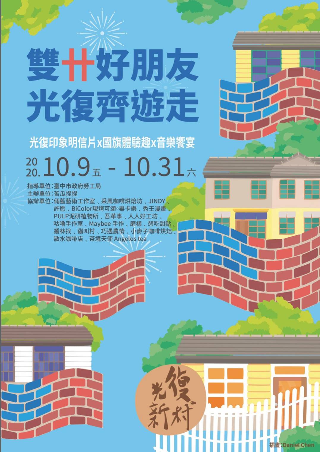 歡慶雙十國慶,霧峰區光復新村自今(9)日起至11日止,舉辦「雙十好朋友,光復齊遊走」,只要至創業青年服務中心領取「消費過關卡」,在指定青年店家消費10元以上,並按讚店家臉書粉絲專頁或追蹤店家IG,集滿2個不同青年店家戳印,即可獲得青年店家明信片「苦瓜捏捏」(限量300),當日寫完明信片還可免費寄送(郵寄範圍限台灣),喜歡收集明信片的朋友,千萬別錯過。