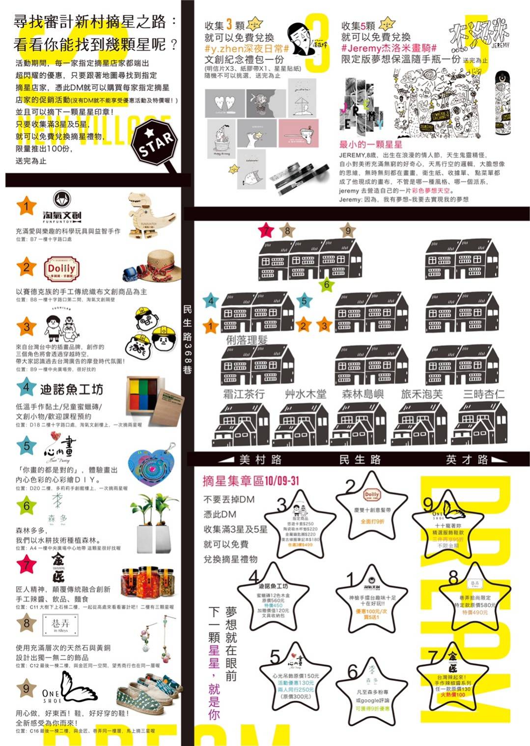 此外,西區審計新村青創基地也舉辦「10月,一起來摘星」,今日至10月底止,只要到指定青年店家購買指定商品即可蓋章集點,集滿3顆星即可兌換文創小禮「y.zhen深夜日常」(限量70),集滿5顆星可兌換夢想星星限定版保溫隨手瓶「Jeremy藝術家」(限量30),歡迎來基地遊玩,集點換好禮。