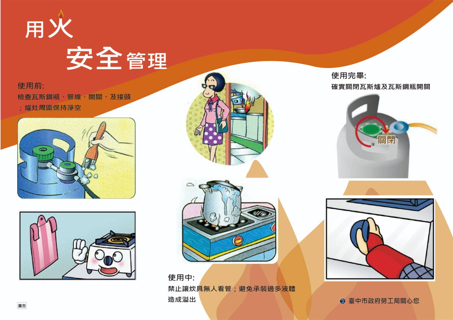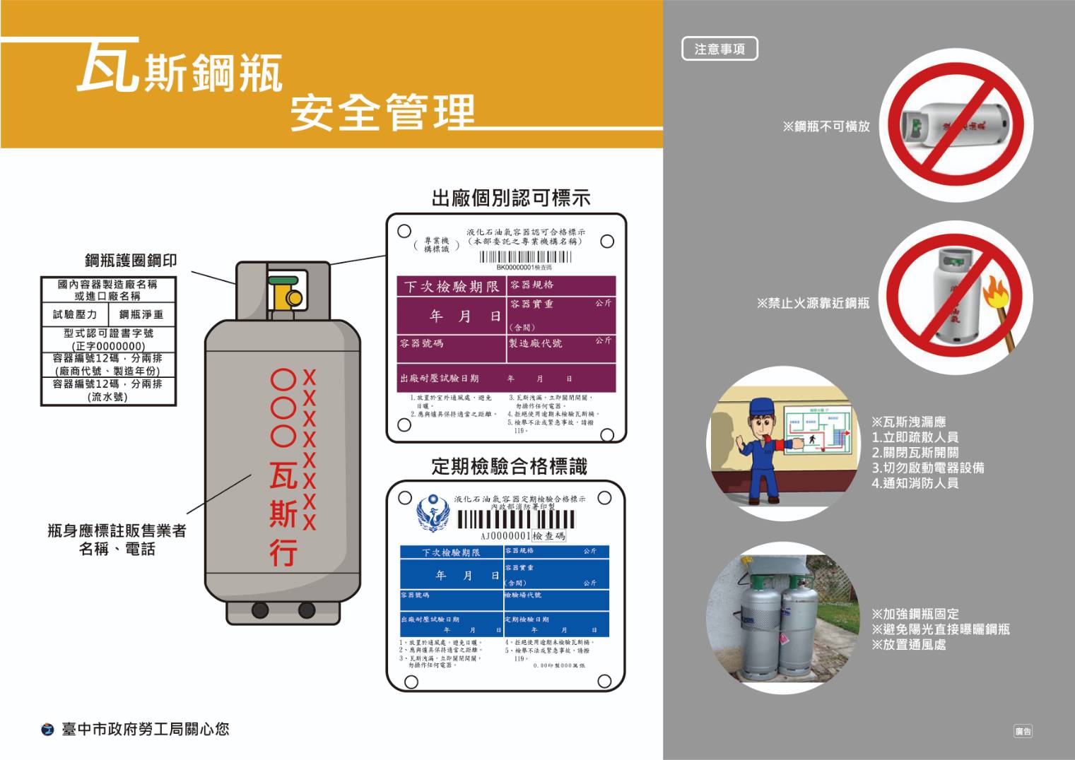 針對國內餐飲業者常使用瓦斯鋼瓶,台中市政府勞工局為強化業者消防安全意識,今年已舉辦2場宣導會,共54間事業單位參與,呼籲業者應訂定瓦斯容器更換標準作業程序,及緊急事故應變處理方法,若未依規辦理,可依《職業安全衛生法》處3萬元以上30萬元以下罰鍰。
