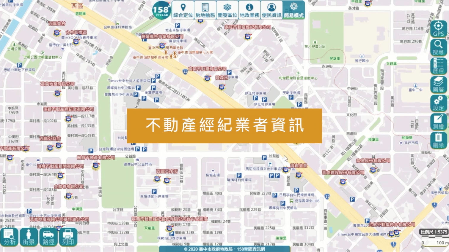 台中市政府地政局為優化地政服務,推出「158+空間資訊網」,提供公開市政空間資訊查詢服務,包括地籍圖資、土地開發區、市地重劃徵收案件、不動產交易等,讓民眾快速取得所需地政資訊,瞭解生活周圍的公共建設、使用分區及未來發展或開發訊息。