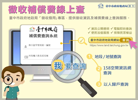 地政局指出,徵收補償費遲遲未領取的原因複雜,經統計,最大主因是姓名或住址不全、未辦繼承、民眾不知道有補償費等;其次為有設定抵押權,須抵押權人同意才可領取。為協助民眾領取補償費,地政局建置徵收補償費線上查詢系統( http://iland.taichung.gov.tw:8080/ ),只要輸入姓名、統一編號,就可輕鬆查詢自己的徵收補償金,還能選擇地段地號,查詢歷史徵收道路資訊;也可上地政局「158空間資訊網」 ( https://lohas.taichung.gov.tw/webgis/index.html ) 點選地政業務、公告徵收土地查詢,框選公告徵收土地,還可揭露地理區位、鄰近實價登錄等資訊。