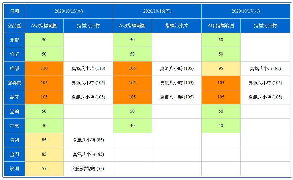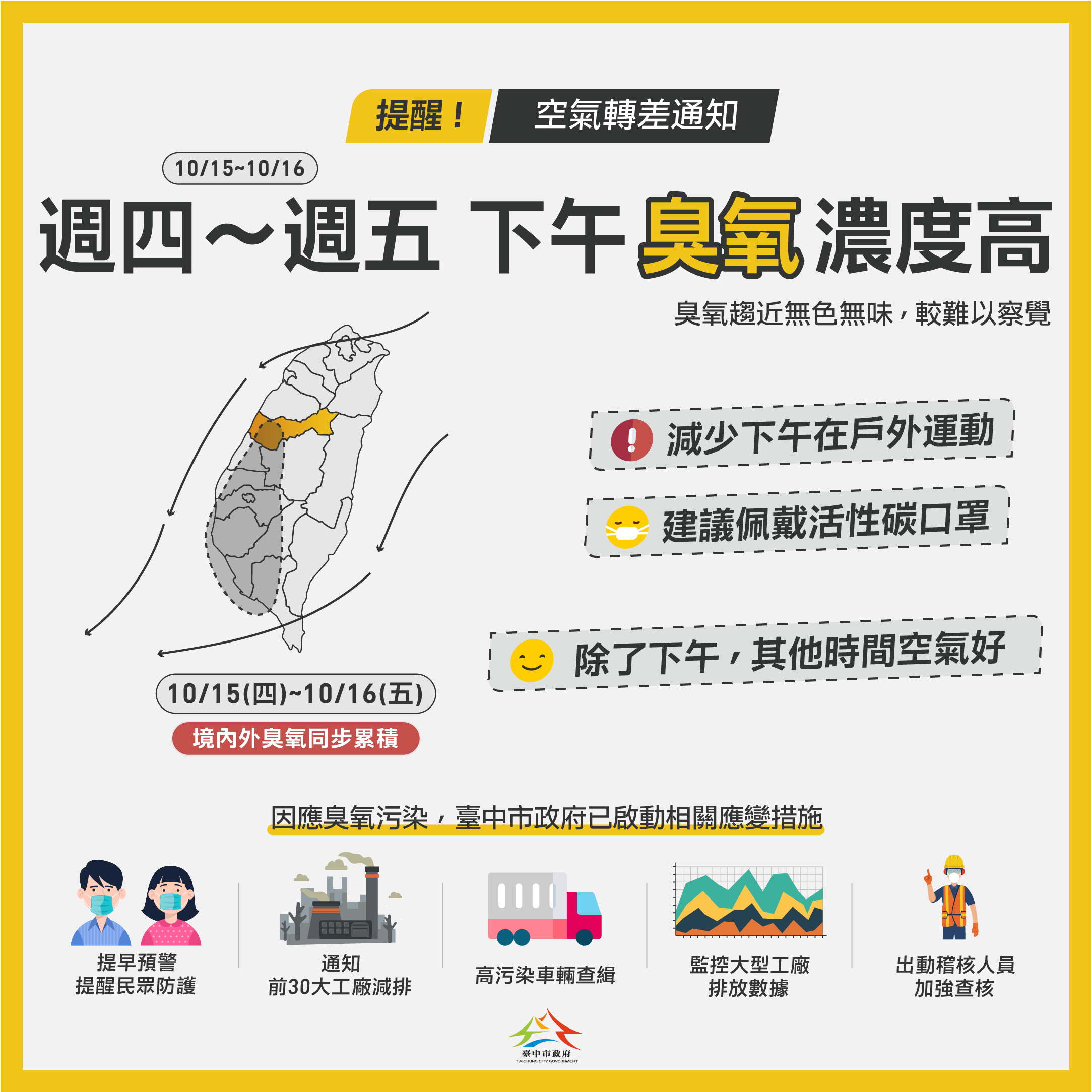 根據環保署空氣品質預報及監測資料顯示,受東北風吹拂,及東亞附近臭氧背景值偏高,持續有少量境外臭氧吹向台灣,中南部地區因位於下風處,污染物較易累積,且受午後受光化作用影響,臭氧濃度易上升,今(15)明兩日下午空品恐達「橘色提醒」等級,提醒市民留意空品變化、做好防護措施。