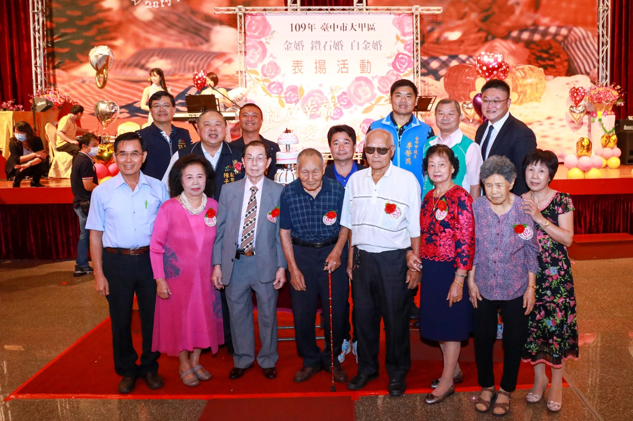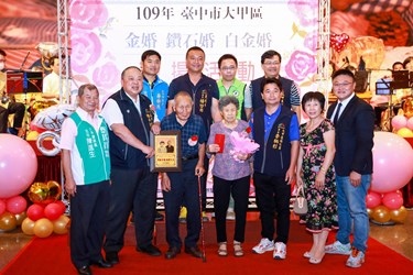 台中市大甲區今(16)日舉行109年度金婚、鑽石婚暨白金婚紀念表揚活動,邀請結婚滿50、60、70週年以上共160對模範夫妻接受表揚,台中市政府副市長陳子敬代表市長盧秀燕頒獎與會伉儷,表彰一起攜手走過半個世紀、守護著堅貞愛情婚姻的美德。