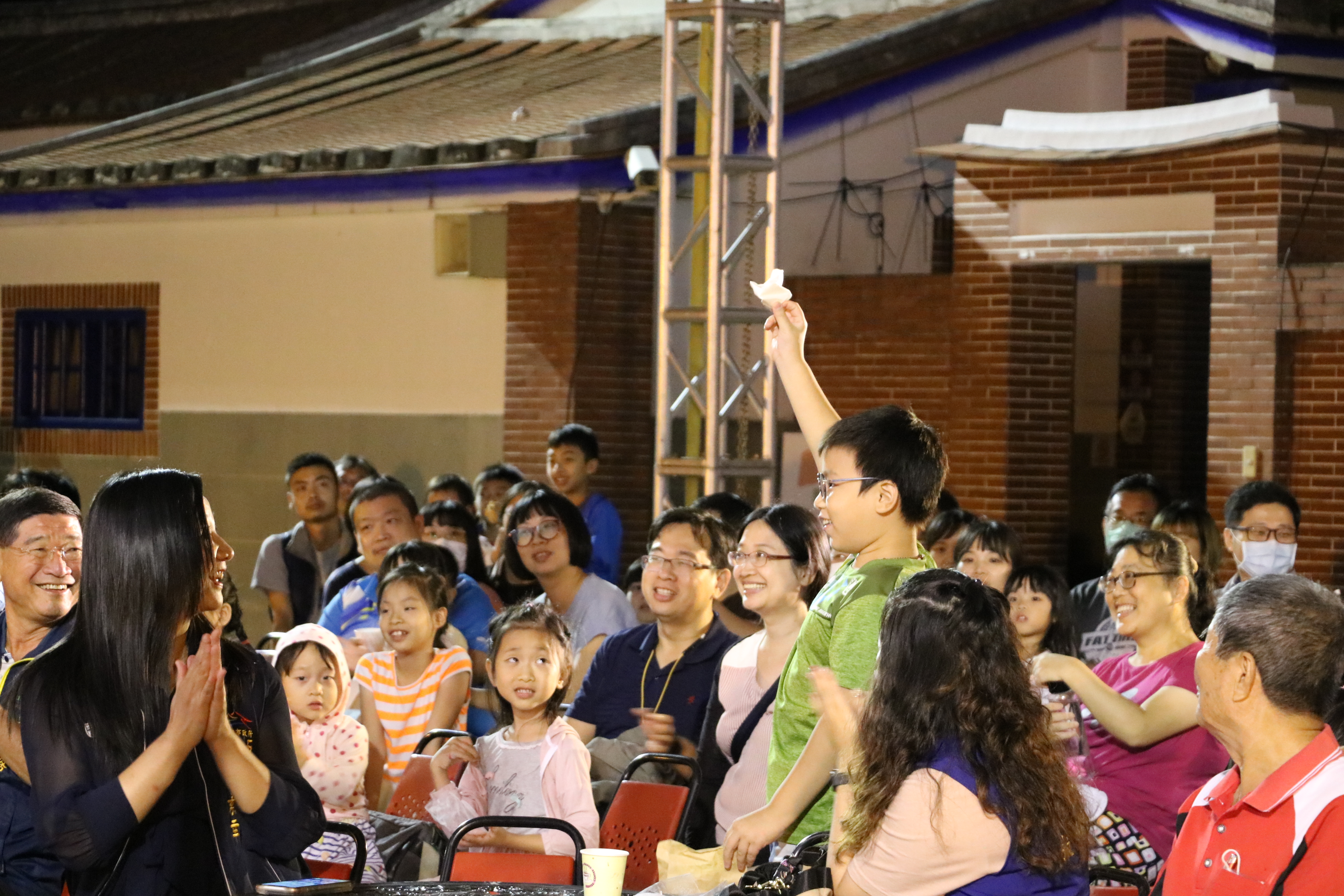 台中市政府客家委員會昨(17)日晚間於石岡土牛客家文化館舉行「大人細子秋夜電影院」露天電影放映活動,在充滿懷舊風味的三合院中庭播放大人小孩都適合欣賞的冒險喜劇動畫《1/2的魔法》,也舉行魔術秀、拼貼活動、紅粄麵團體驗等,再現客庄文化樸質風情。