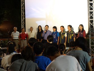 昨日市議員冉齡軒、石岡區長劉素幸、市府客委會委員林若蓁、陳乙升、許勝明、地方稅務局東勢分局主任曾金連及各里長和社區發展協會理事長等人皆參與活動,與民眾齊聚三合院前廣場感受秋風涼爽的電影之夜。