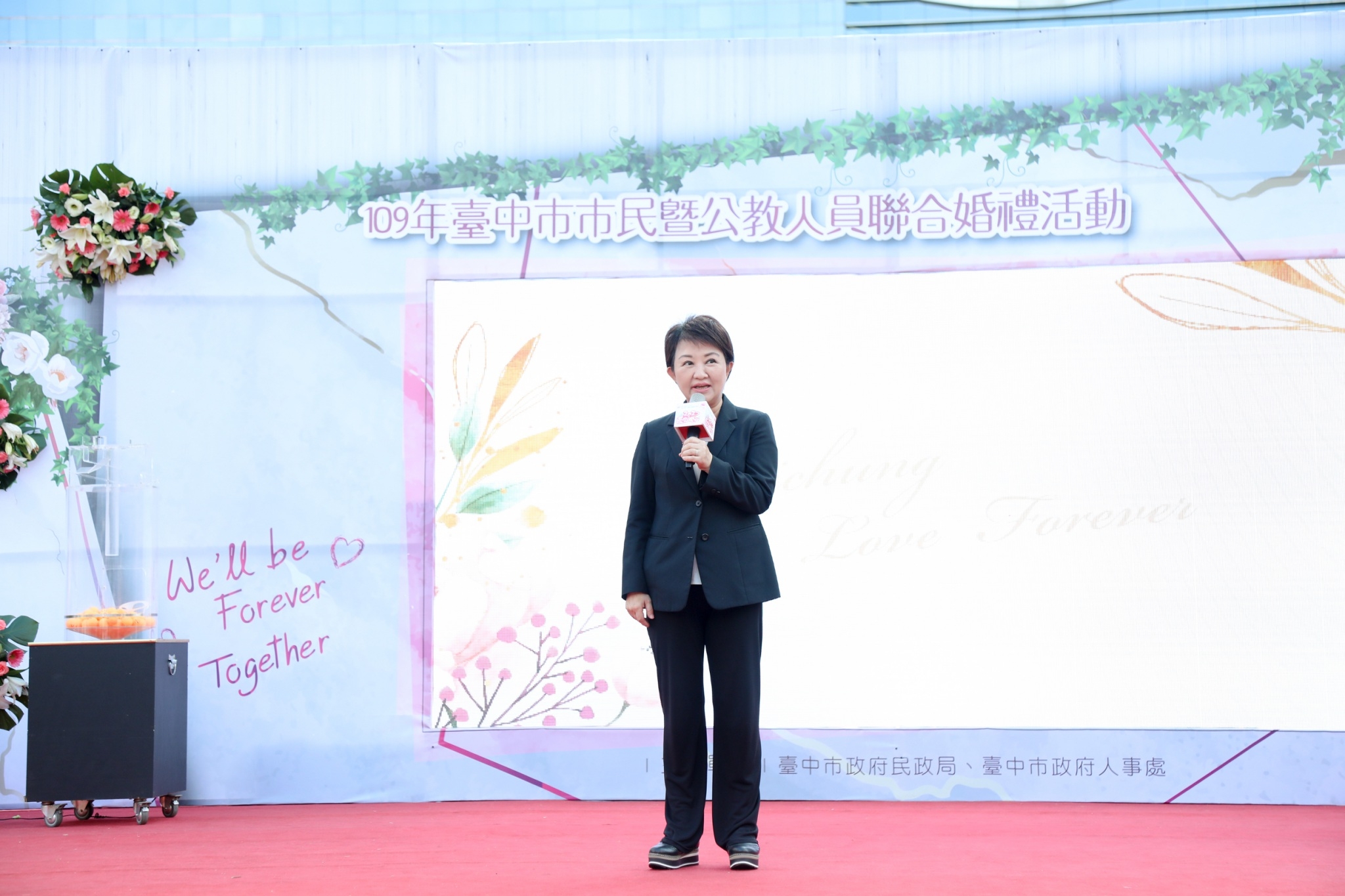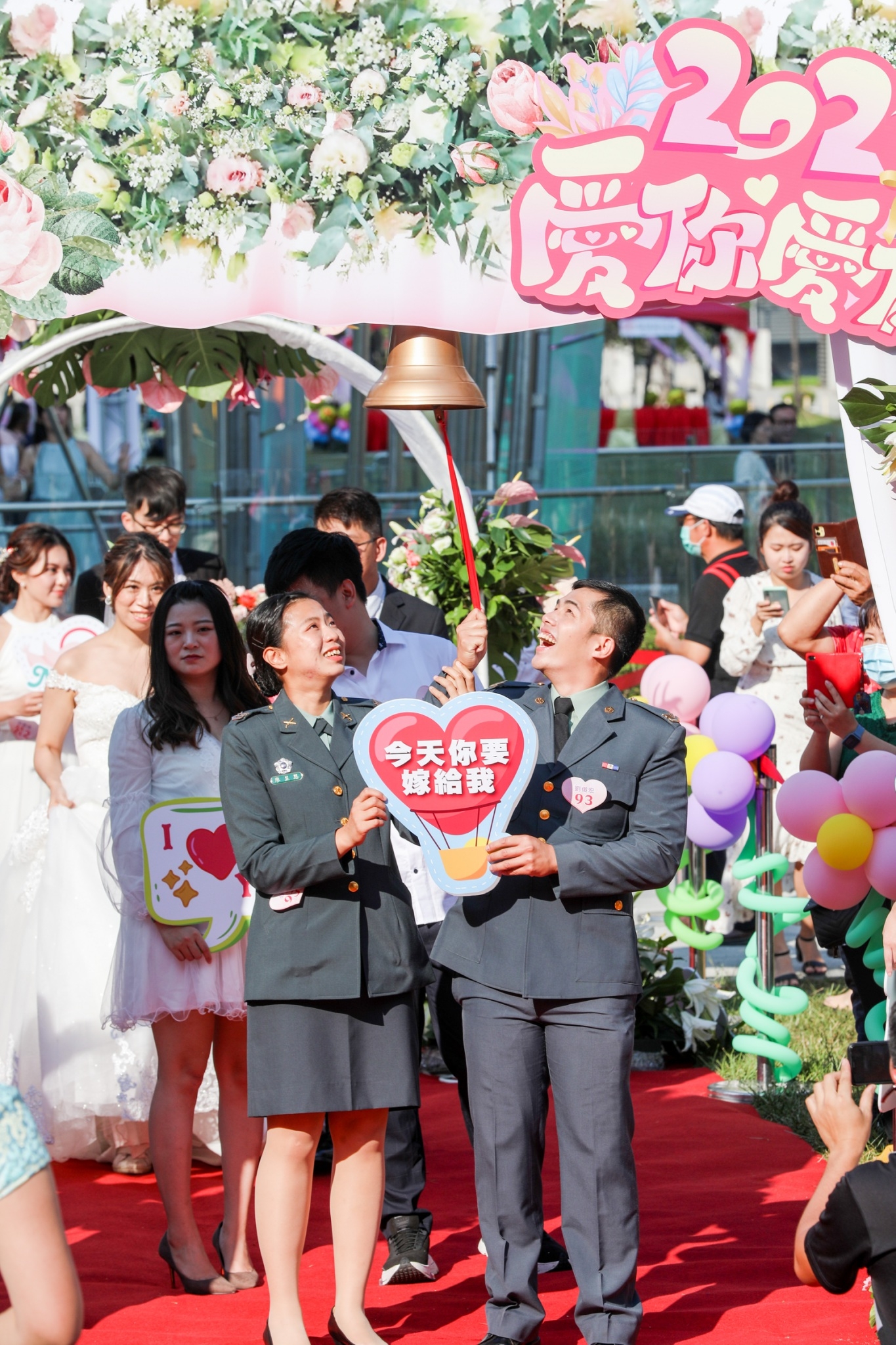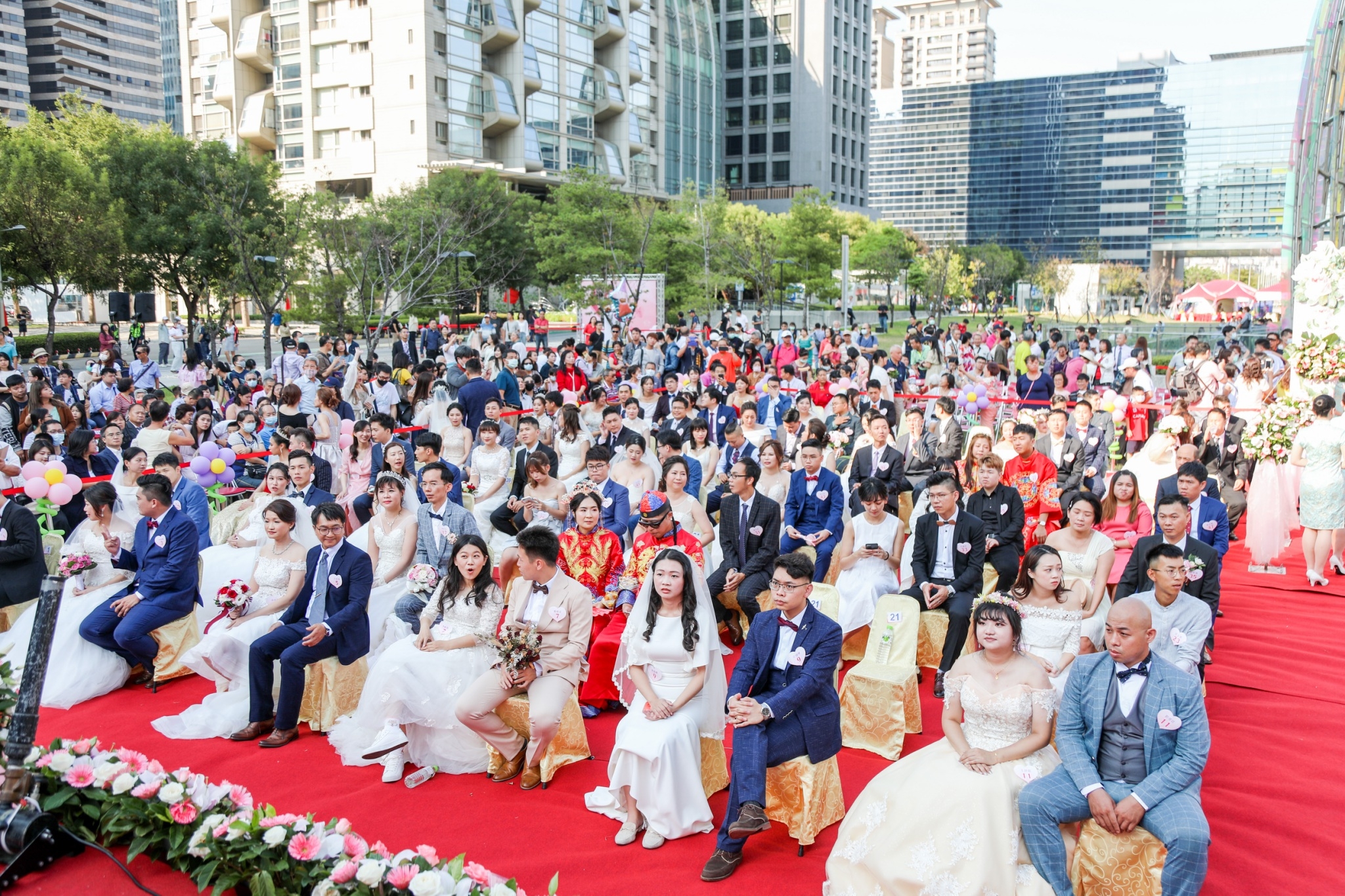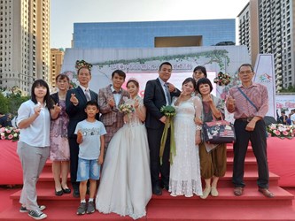 今日聯合婚禮由盧市長擔任主婚人、民政局長吳世瑋擔任證婚人,市議員羅廷瑋、市府人事處長陳杉根、中區區長林忠訓、東區區長何宜真、西區區長王瑞嘉、西屯區長陳寶雲、烏日區長陳嘉榮、大肚區長白峨嵋、后里區長賴同一、中區戶所主任林淑美、東區戶所主任喻梅芝、北區戶所主任江惠雯、西屯區戶所主任吳俊義、北屯區戶所主任劉月琴、豐原區戶所主任林伶香、市議員林孟令、陳政顯服務團隊均到場見證。