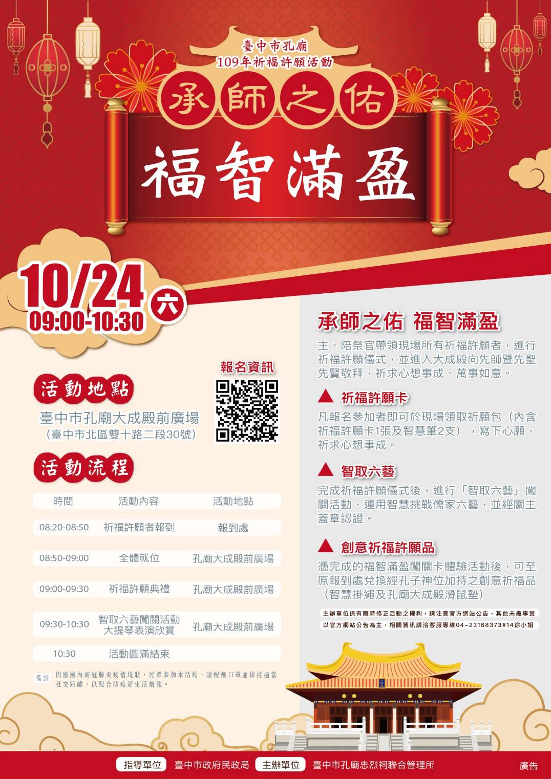 保佑學子考試順利,台中市孔廟今年第二場次祈福許願活動「承師之佑、福智滿盈」將於10月24日上午9時在孔廟大成殿前廣場舉行。此次活動除傳統古禮儀式也融入現代六藝闖關,參加並完成闖關者,將可得到孔子「加持」過的創意祈福品,目前活動尚有名額,線上及電話報名明(20)日截止,歡迎把握機會。