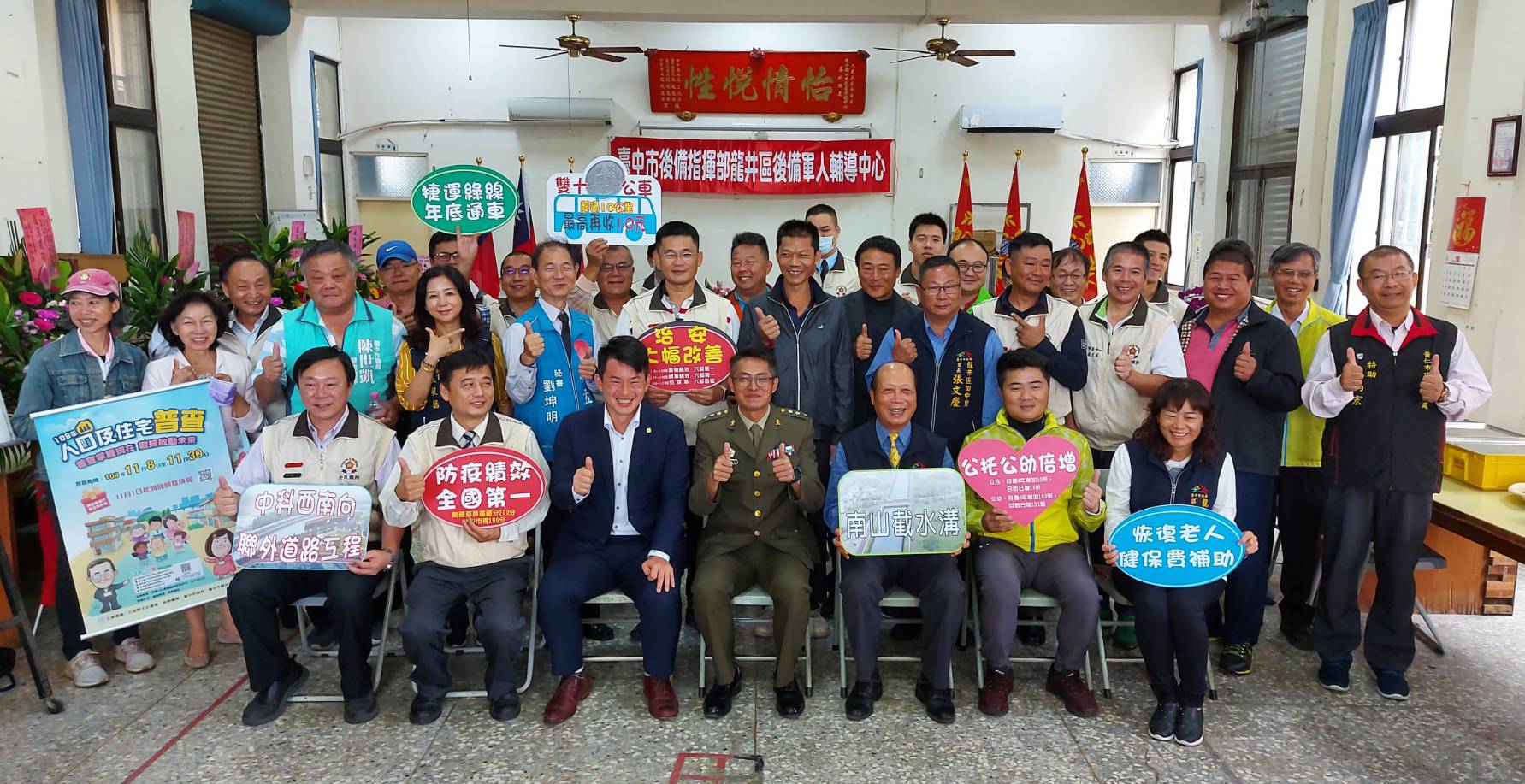 今日揭牌典禮包括市政顧問吳信、台中市後備指揮部指揮官邱孟俊、立委陳柏惟、前立委顏寬恒,以及市議員林孟令、吳瓊華、林汝洲、陳世凱服務團隊均到場見證輔導中心辦公處成立。(10/23*18)*民政局
