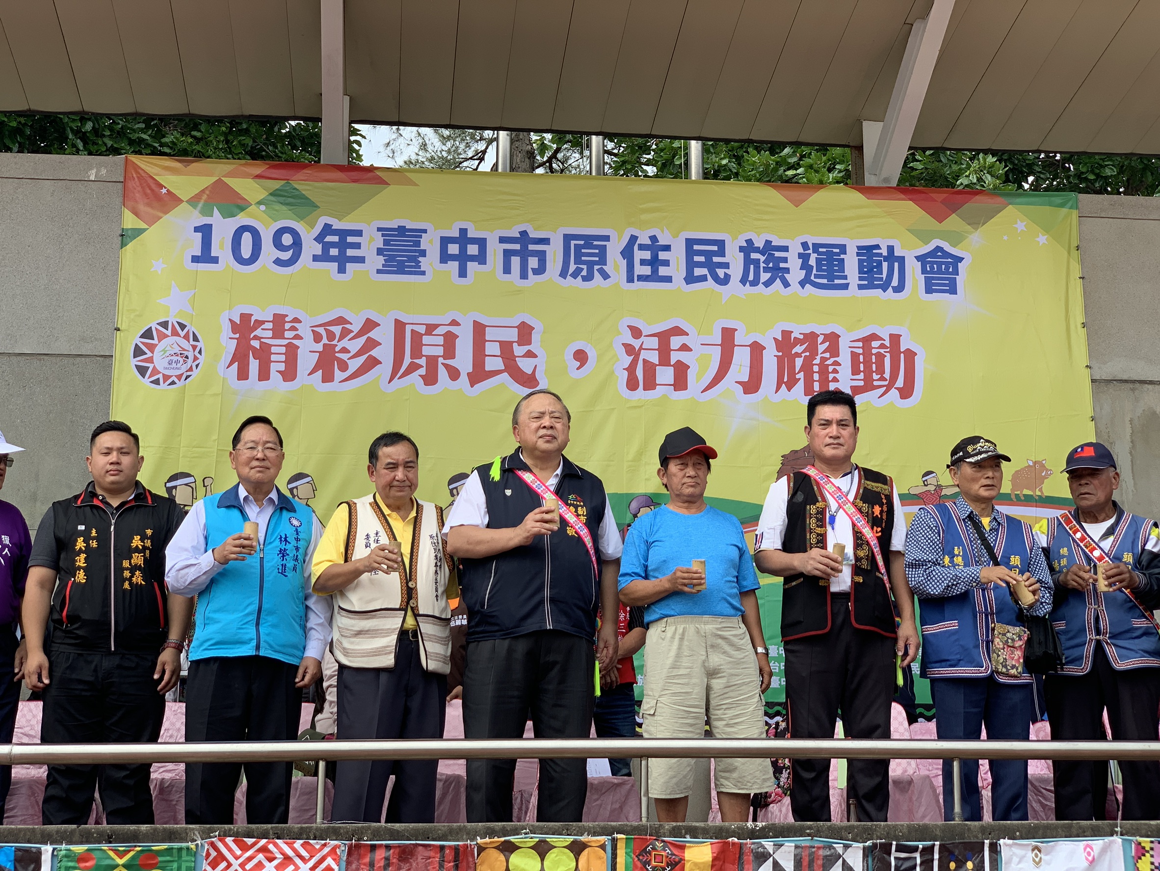 今日台中市副市長陳子敬出席活動,他表示,市原運組隊以原住民社團為代表參加,可增進散居在中市各區的原住民族及各原住民社團的聯繫,增進彼此情感;台中市政府原住民族事務委員會主委林益陸表示,此活動己邁入第5屆,現代運動結合傳統技藝,帶動原住民族人運動休閒風潮,期許參賽族人爭取佳績。