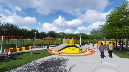 建設局長陳大田指出,市府力推「台中美樂地計畫」,今日在龍井區拍瀑拉公園舉辦龍井、大肚、烏日、太平、大里、霧峰等6區11座共融公園聯合動土儀式,總計投入1,466萬元經費;其中拍瀑拉公園是「共融公園」及「陽光公廁」推動重點區域,規劃將拍瀑拉族「走鏢」活動轉化為遊戲場內關卡,利用圖騰圍塑出平埔族人圍繞歌唱的原民意象,改善既有公廁汙垢、照明不足、無扶手、缺少無障礙廁間及親子廁間等問題,提升廁間坐蹲比,讓長輩、身障人士使用更舒適。