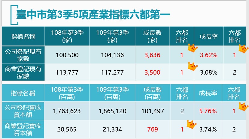 第三季「公司行號經濟指標」出爐,台中市五項指標均拿下六都第一!延續第二季亮眼表現,台中市在公司登記家數成長數、公司登記家數成長率、公司登記資本額成長率、商業登記家數成長數、商業登記資本額成長數等五項指標奪冠,且成長幅度持續攀升,前景看好,企業投資意願節節攀升。