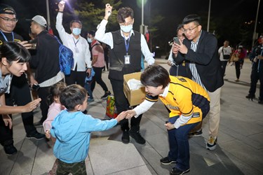 「我爪我驕傲」,盧市長今晚結束市政行程後隨即回到台灣大道市政大樓,穿上中信兄弟球衣與球迷共同為中信兄弟加油,現場球迷看見盧市長加入看球,紛紛開心上前合照,盧市長也發放糖果給到場觀戰的小朋友,氣氛溫馨。
