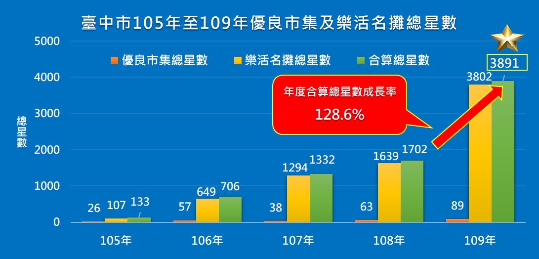 台中市政府經發局表示,台中今年市集與名攤總計斬獲3,891顆星,相較去年度1,702顆星「翻倍」成長,並有25處獲優良市集,其中四星6處、三星17處、二星7處,市集總星數有89顆星;樂活名攤計有1,729攤,其中五星1攤、四星32攤、三星381攤、二星1,211攤、一星104攤,名攤總星數有3,802顆星,市集與名攤總計3,891顆星,總星數為全國15縣市第一名,也是各縣市中歷年最佳成績。